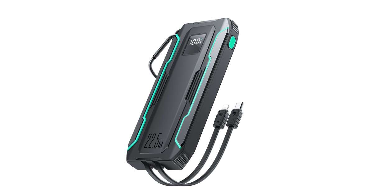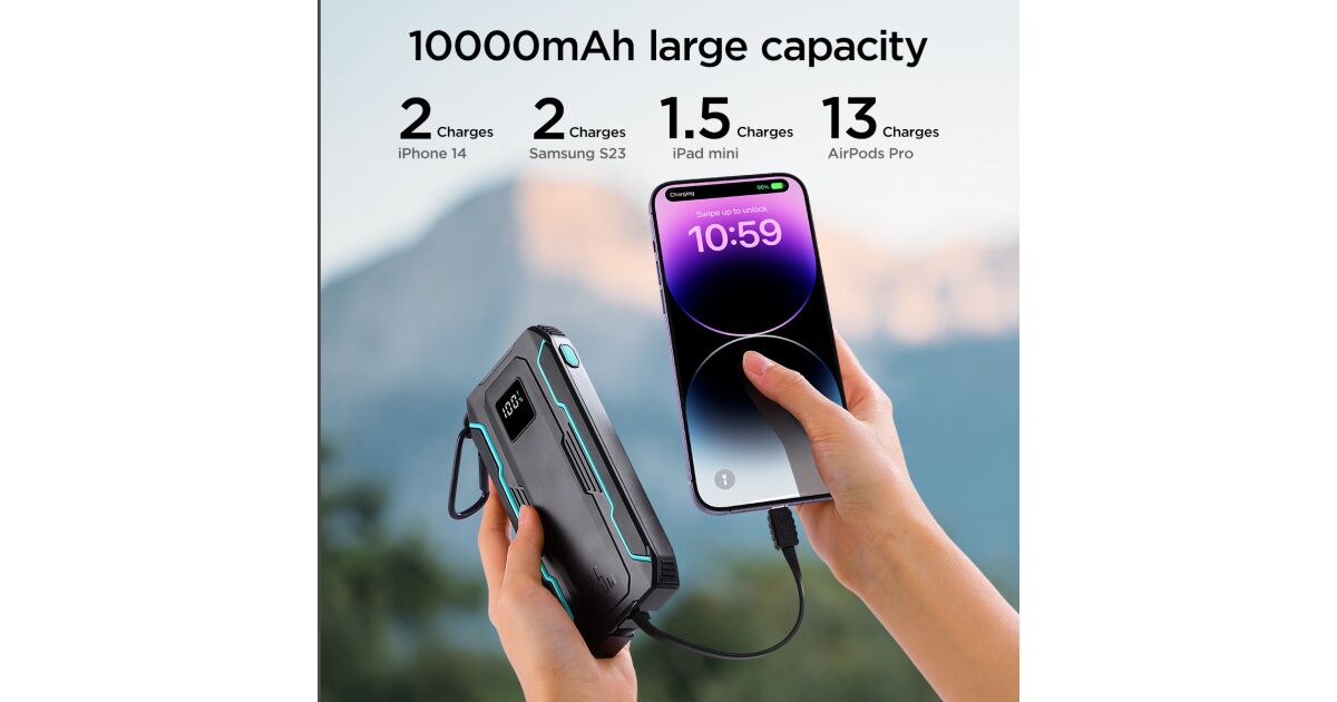Tento kompaktný a odolný powerbank je ideálny na cestovanie, výlety alebo dokonca núdzové situácie. Vďaka vstavaným káblom USB-C a Lightning môžete nabíjať až 4 zariadenia súčasne, či už ide o telefón, tablet alebo dokonca inteligentné hodinky.