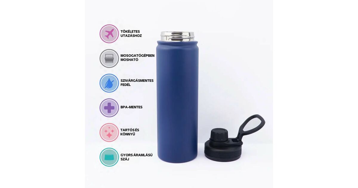 Modrá termoska z nehrdzavejúcej ocele s nepriepustným uzáverom, funkcia udržiavania chladu aj tepla - 650 ml popis
