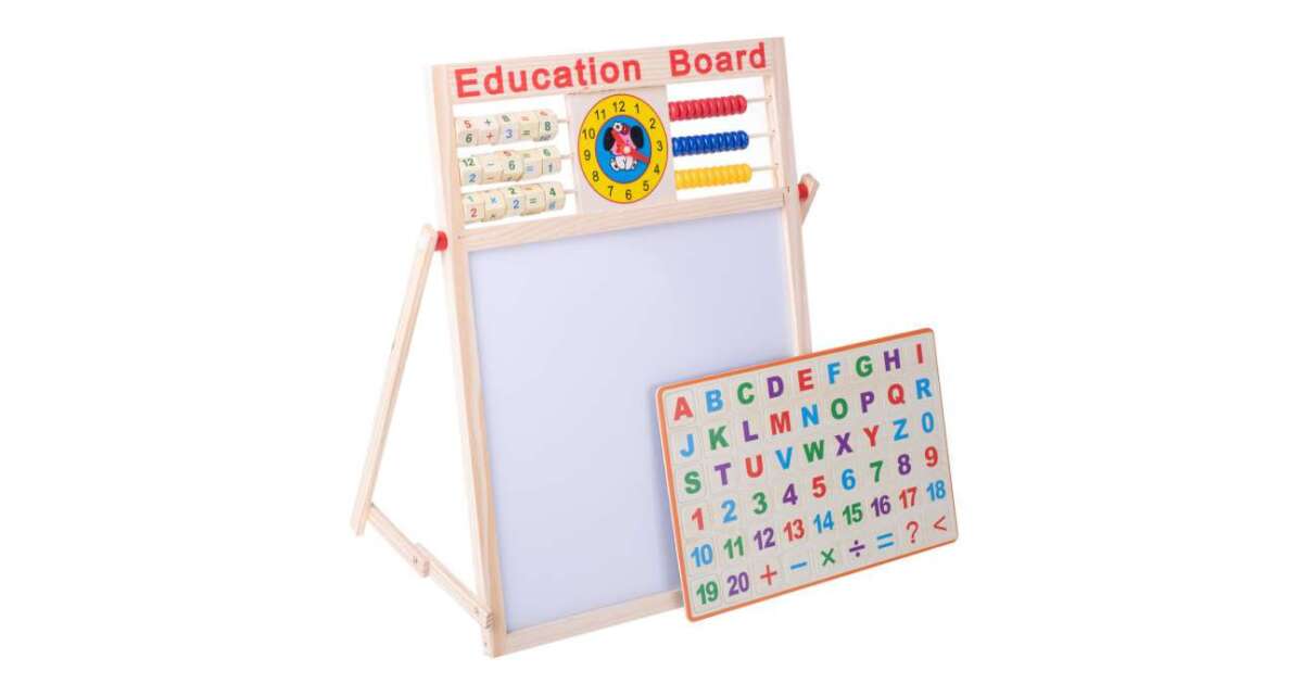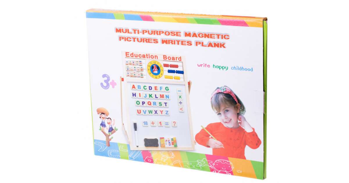 Táto dvojstranná drevená edukačná tabuľa je perfektná na to, aby sa deti učili a zároveň sa aj zabávali! Na jednej strane nájdeš bielu tabuľu na písanie fixkou, na druhej strane čiernu kriedovú tabuľu. K tabuľke patrí 54 magnetických písmeniek a číslic, s ktorými si deti môžu kreatívne hrať a učiť sa. Abakus pomôže pri osvojovaní si počítania a hodiny pri pochopení merania času.