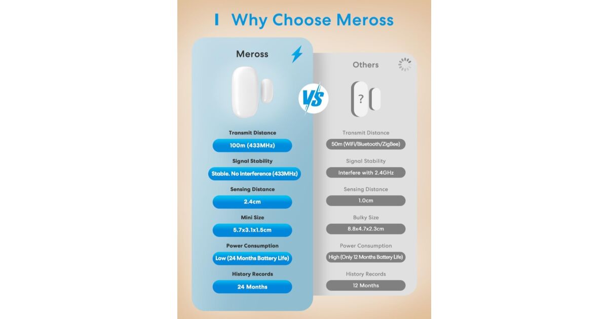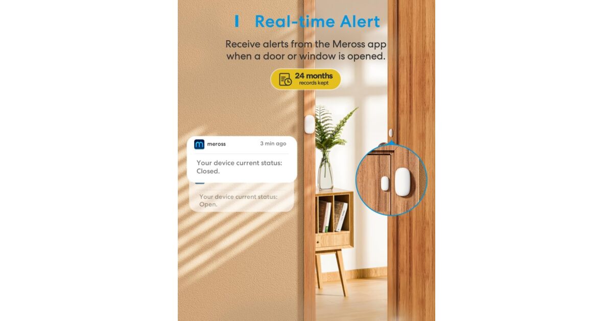 Vďaka Wi-Fi technológii a priloženému Meross hubu senzor prenáša stav dverí a okien v reálnom čase. Ak zostane okno náhodne otvorené alebo sú dvere násilne otvorené, okamžite dostanete upozornenie. Stav domácnosti môžete skontrolovať kedykoľvek – aj keď nie ste doma.