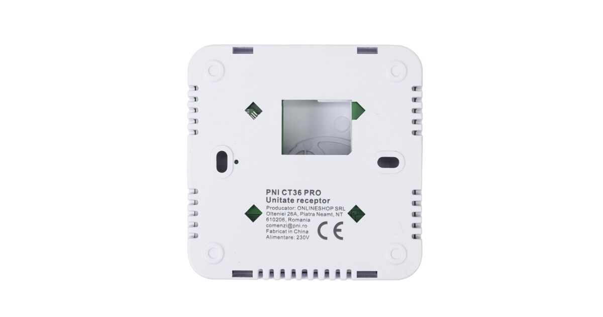 Identifikácia produktu Kód produktu PNI-CT36PRO Všeobecné vlastnosti Typ produktu Káblový termostat s ovládaním cez internet Určené pre Kotly na plyn, drevo, pelety Kompatibilná značka Univerzálny MONTÁŽ Stôl/stena Materiál Plast Farba Biela Pripojenie - Bezdrôtové pripojenie k internetovému routeru: WiFi 802.11b/g/n (2,4 GHz); WPA2 (TKIP a AES) - Bezdrôtové pripojenie medzi 2 jednotkami: rádio 868 MHz - Káblové pripojenie ku kotlu Typ vstupného napájacieho napätia Centrálna jednotka: batérie (2 alkalické batérie AAA 1,5 V, nie sú súčasťou balenia) Prijímacia jednotka: sieť 230 V Nastavený teplotný rozsah 5 – 35 °C Krok nastavenia teploty 0,5 °C Zobrazený teplotný krok 0,1 °C hysterézia ± 0,1 °C Prevádzkové parametre - Merateľná teplota: 0 - 50 °C - Jednotka merania: °C - Citlivosť senzora, hysterézia: ± 0,1 °C - Hysterézia mŕtvej zóny: 0,1 °C - 6 °C Funkcie - 2 prevádzkové režimy: kúrenie (zima)/chladenie (leto) - Diaľkové ovládanie teploty z mobilnej aplikácie - Denný program: 4 časové pásma na deň - Týždenný program: pondelok - nedeľa - Lokálna regulácia teploty - Mobilná centrálna jednotka - Ochrana proti zamrznutiu - Detekcia otvoreného okna Vyhradená aplikácia pre smartfóny Tuya Smart / Inteligentný život Konfigurovateľné parametre - kalibrácia vnútorného teplotného senzora - minimálna a maximálna nastaviteľná teplota - teplota proti zamrznutiu - hysterézia - parametre - otvorené okno Komunikačná frekvencia 2,4G Funkcie centrálnej jednotky kŕmenie 2 batérie LR3/AAA (nie sú súčasťou balenia) Obrazovka 3,7" podsvietený Parametre zobrazenia - Nameraná teplota (v miestnosti) - Nastavená/požadovaná teplota - Aktuálny čas - Aktuálny program - Stav bezdrôtového pripojenia Montážna plocha Stena / Stôl Funkcie prijímacej jednotky Montážna plocha Stena Komunikačná frekvencia - s internetovým routerom: WiFi 802.11b/g/n (2,4 GHz) - s centrálnou jednotkou: rádio 868 MHz - s ústredným kúrením: káblové kŕmenie 230 V striedavého prúdu 50/60 Hz Typ centrálneho ovládania Relé NO/NC bezpotenciálové (bez napätia) Parametre obvodu ovládateľného relé (maximálne) 12 – 240 V AC/DC, 10 ampérov Funkcie - 2 multifunkčné tlačidlá - 2 LED diódy indikácie stavu - Možnosť uzavrieť klasický riadiaci obvod NO (normálne otvorený) vykurovacieho zariadenia, ktorý spĺňa parametre relé Balenie obsahuje Centrálna jednotka Áno Prijímacia jednotka Áno Montážne príslušenstvo - Nástenný držiak - Stolový stojan - Montážne skrutky