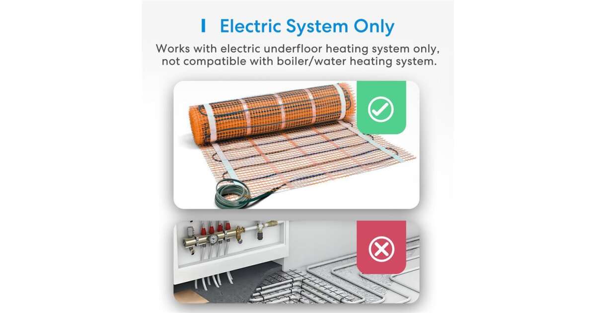 Kompatibilný iba s elektrickými podlahovými vykurovacími systémami, nie je vhodný pre systémy s kotlom alebo ohrevom vody.