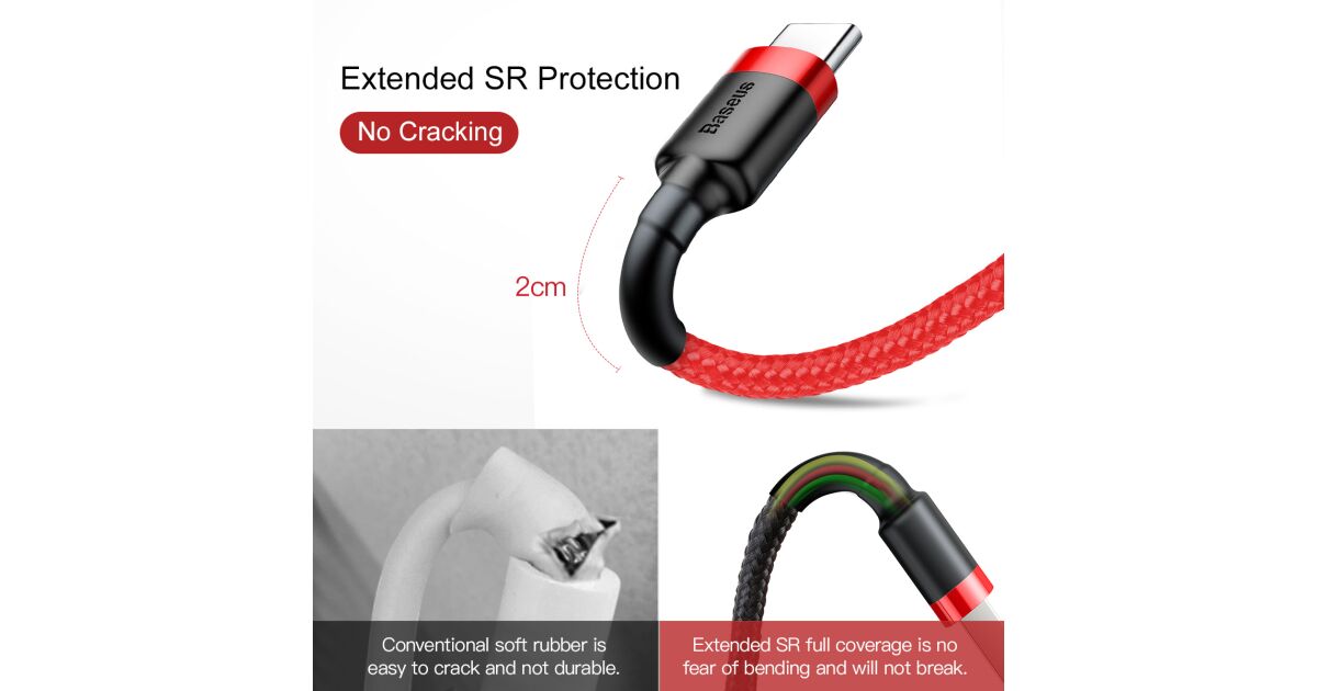 Spojenie medzi káblom a konektorom je vyrobené z dvoch vrstiev mäkkého a odolného materiálu, vďaka čomu je oveľa odolnejšie pri každodennom používaní. Nylonové opletenie zabraňuje zamotávaniu. Kábel je flexibilný a ľahko sa s ním manipuluje.