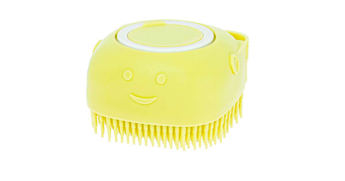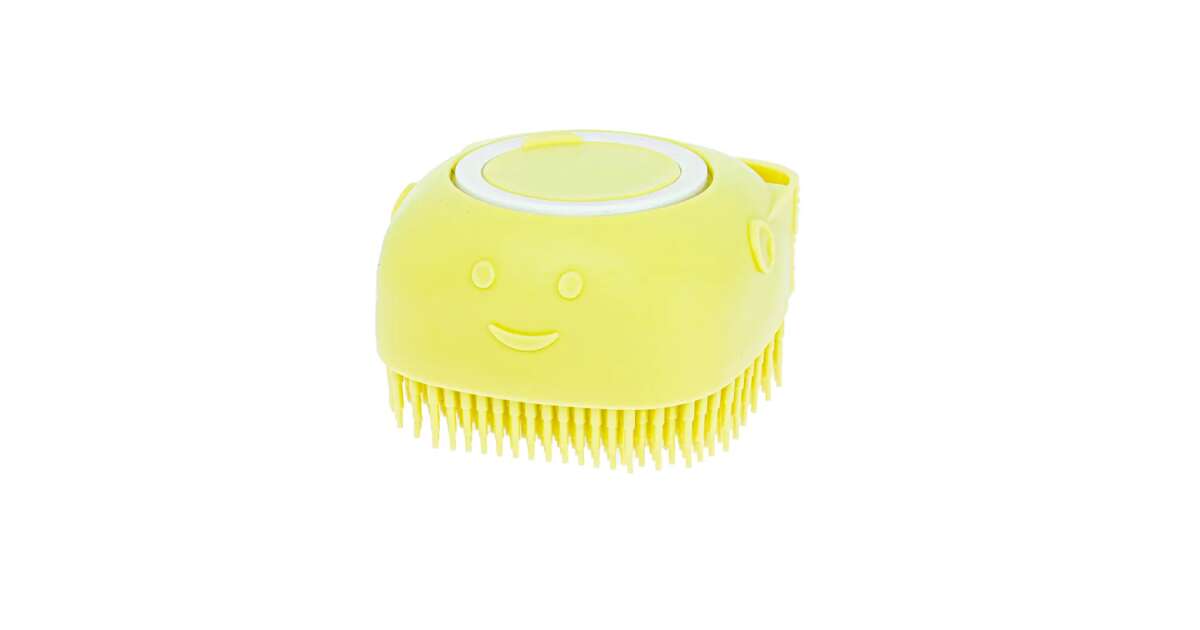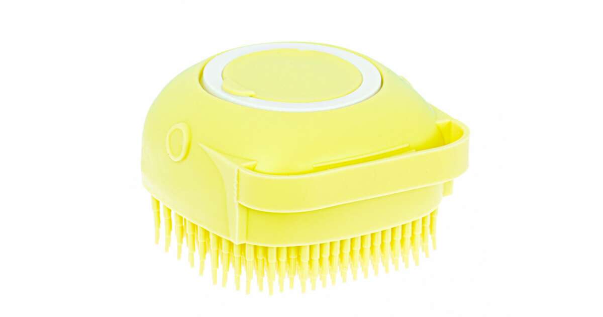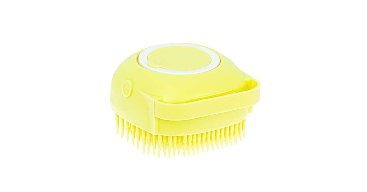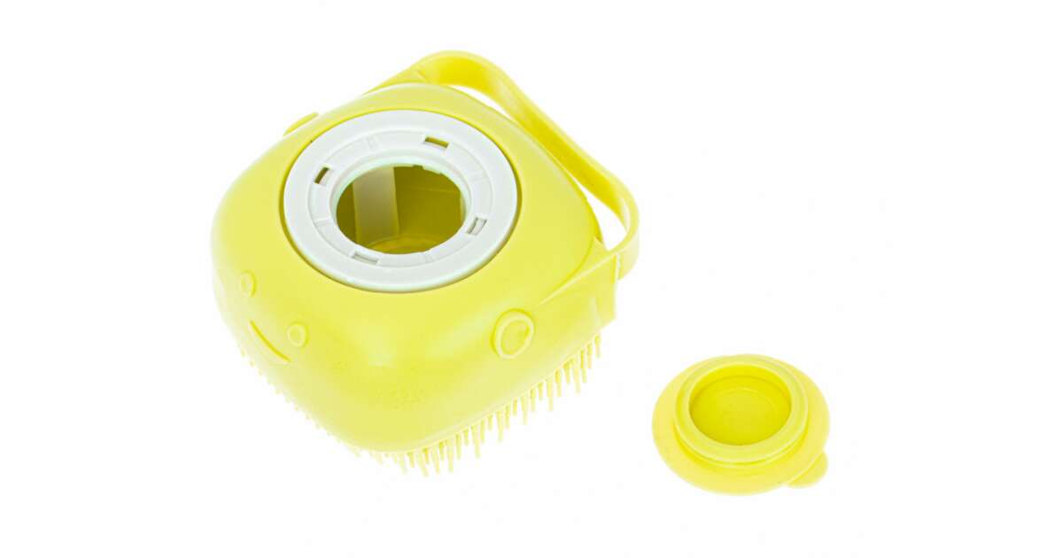 Silikónová kefa 2v1 na umývanie a česanie psov a mačiek, so vstavanou nádobkou, žltá