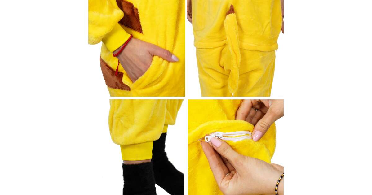 Toto Springos Pikachu kigurumi pyžamo je perfektné pre všetkých, ktorí milujú pohodlie, zábavu a roztomilé postavičky. Pyžamo vyrobené z 100% polyesteru je príjemné na nosenie, či už na domáce relaxovanie alebo na zábavnú párty.