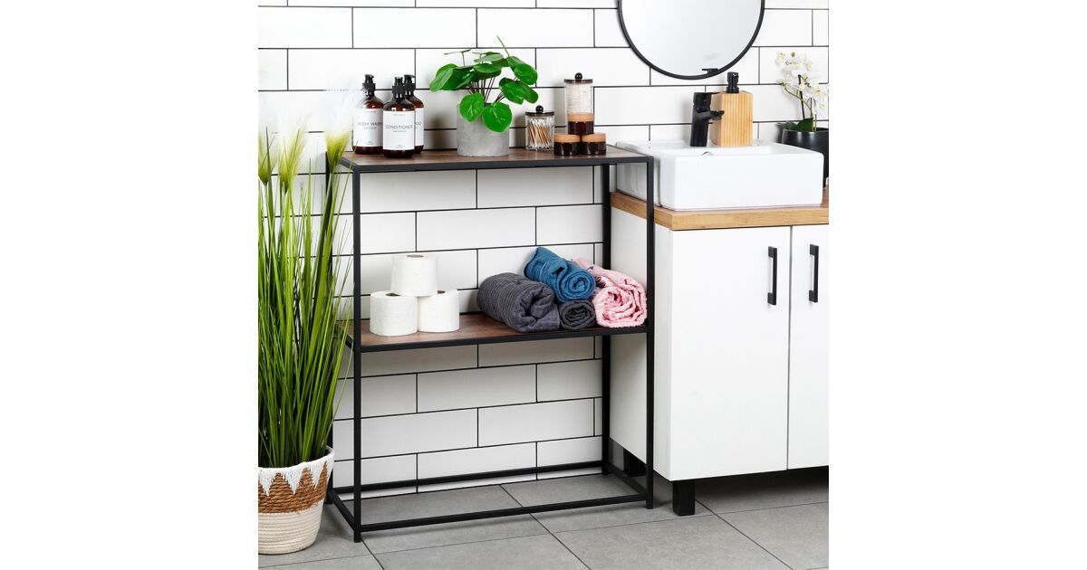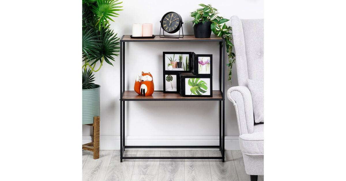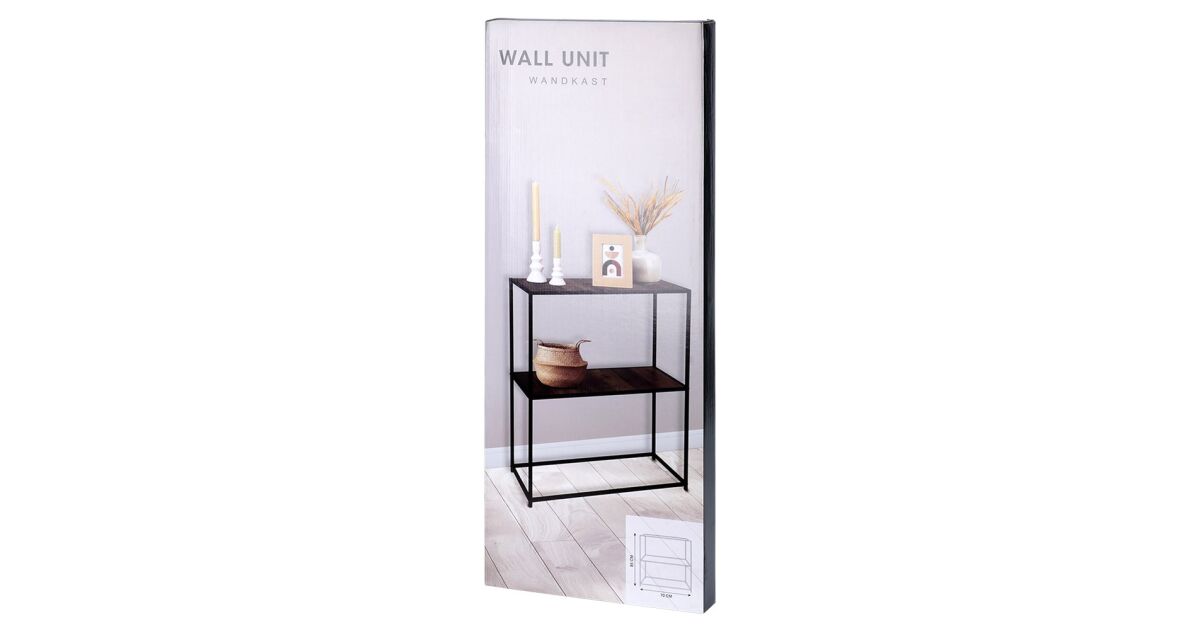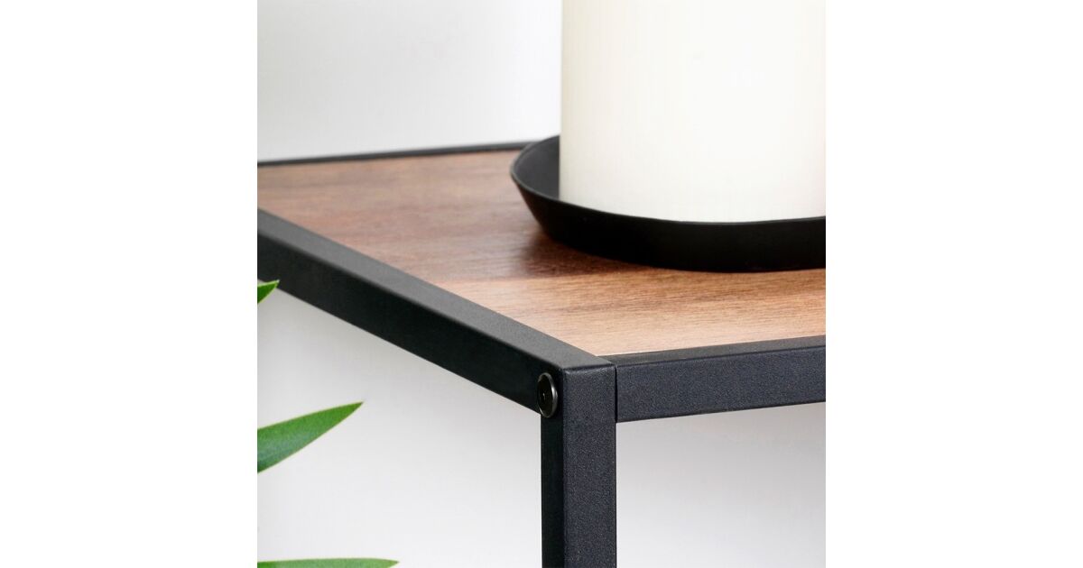 - Dizajn: Moderný industriálny štýl s čiernou konštrukciou a policami s teplým dreveným vzhľadom