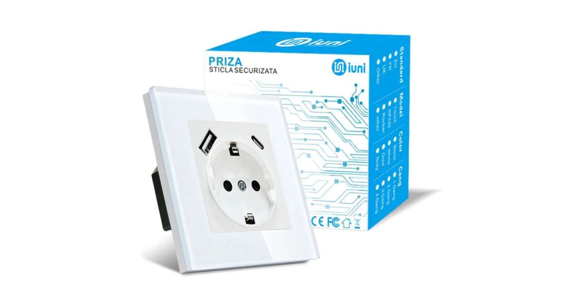Gniazdo ze szkła hartowanego, porty USB-A i USB-C, iUni UC1, 16A popis