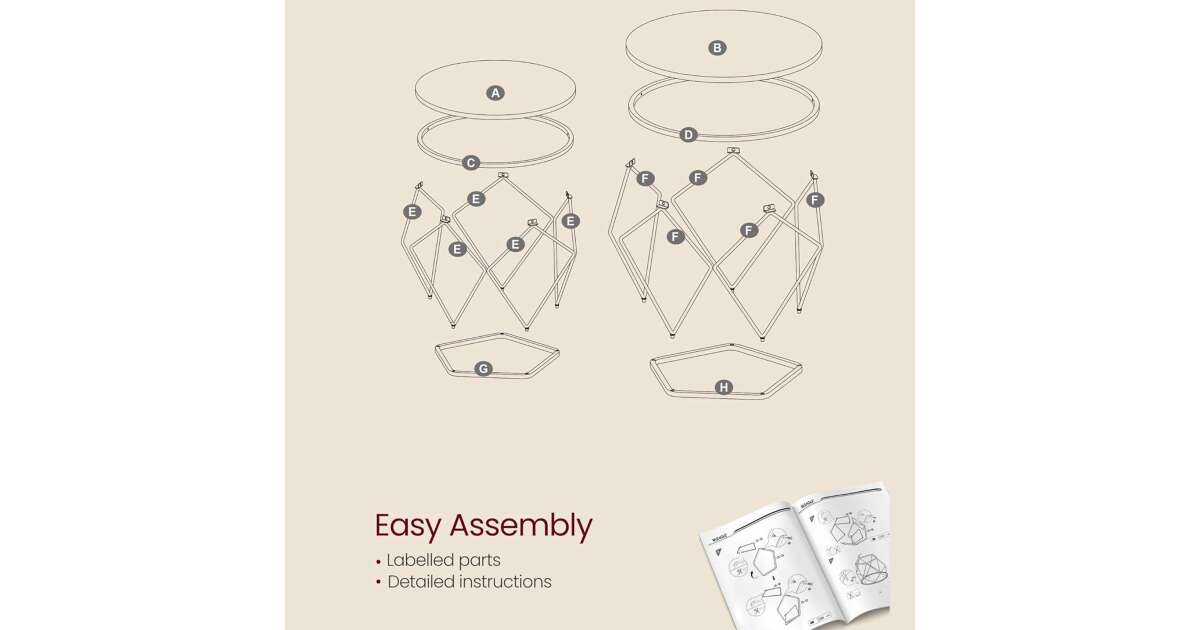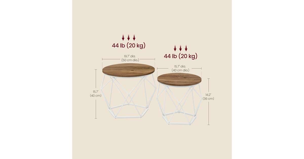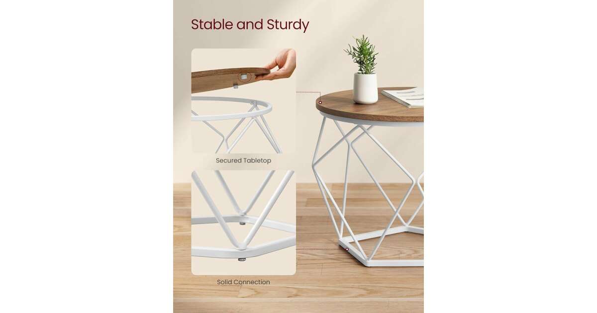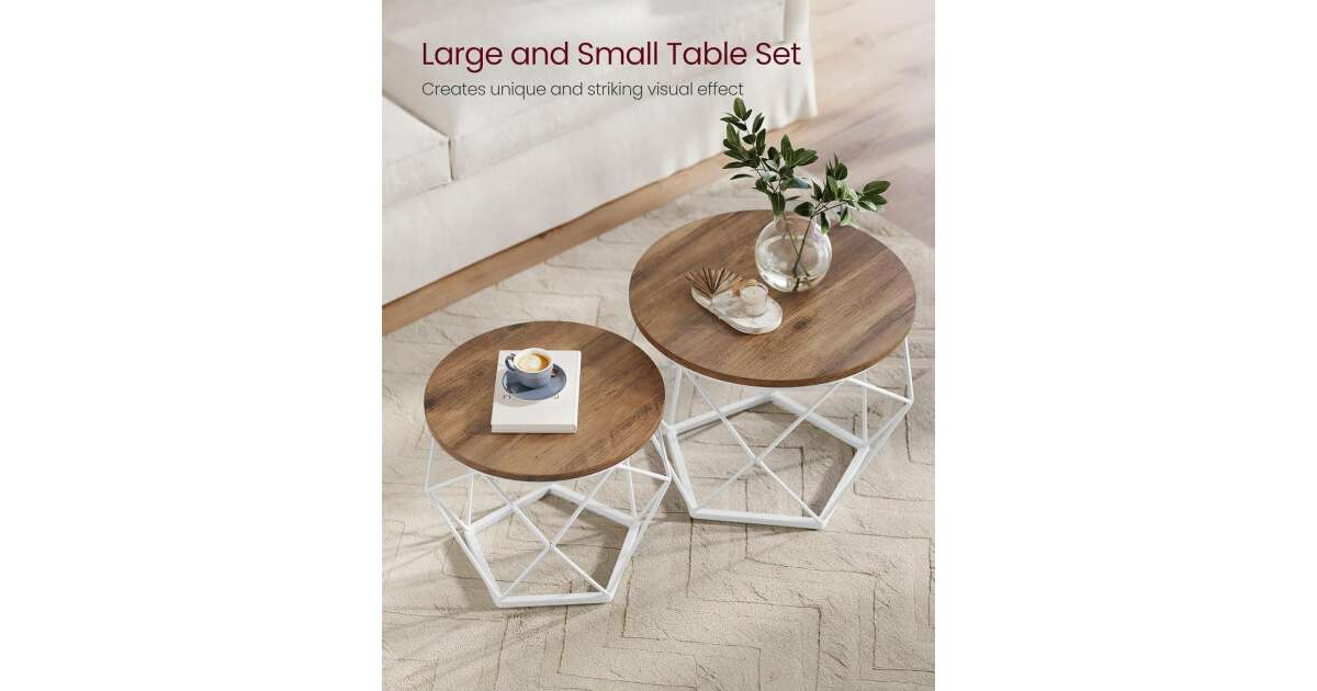 Okrúhle konferenčné stolíky, sada 2 bočných stolíkov, moderný štýl, odnímateľná stolová doska, oceľový rám, do obývačky, medovo hnedá a obláčiková biela [Kompaktná veľkosť] Veľký konferenčný stolík meria 50 x 40 cm (Priem. x V) a malý konferenčný stolík meria 40 x 36 cm (Priem. x V); kompaktná veľkosť vhodná do malých priestorov vám umožní nájsť to správne miesto pre popoludňajší čaj, dekorácie alebo notebook do práce [Jednoduchá montáž] Vďaka jasným inštrukciám a označeným častiam dokončíte montáž tejto sady 2 bočných stolíkov skôr, ako sa nazdáte. Nebojte sa, ak stratíte skrutku, v balení sú náhradné diely [Stabilný a silný] Vďaka kombinácii kvalitnej drevotrieskovej dosky a pevného oceľového rámu je táto súprava príručného stolíka stabilná, takže sa nebude kývať zakaždým, keď zdvihnete šálku kávy. Každý malý stolík unesie až 20 kg [Spolu alebo oddelene] Použite 2 bočné stolíky spolu pre harmonickú kombináciu v obývacej izbe na ukladanie izbových rastlín. Alebo ich použite samostatne, jednu vedľa pohovky a druhú v spálni [Moderný štýl] Tieto konferenčné stolíky v modernom štýle do vašej obývačky vnesú do vášho priestoru špeciálny nádych s okrúhlymi medovo hnedými vrchmi a geometrickými bielymi oceľovými podnožami. Ich atraktívny vzhľad zapôsobí na vašich hostí Odnímateľný vrch Vrchnú časť môžete použiť ako podnos, aby ste si mohli priniesť popoludňajší čaj kamkoľvek chcete – dovnútra alebo von. Pevné pripojenie Geometrická oceľová konštrukcia je navrhnutá s pevnými spojmi, aby sa zabezpečilo, že zostane stabilná a nebude sa kývať ani triasť. Technické údaje: Farba: Medovo hnedá, biela Materiál: drevotrieska, oceľ Veľkosť veľkého stola: 50 x 40 cm Veľkosť malého stola: 40 x 36 cm Celková hmotnosť: 7 kg Max. Statická nosnosť každého stola: 20 kg Obsah balenia: 1 x Veľký príručný stolík 1 x malý príručný stolík 1 x montážna súprava 1 x návod Poznámky: Statická nosnosť každého stola je 20 kg. Prosím, neprekračujte hmotnostný limit.