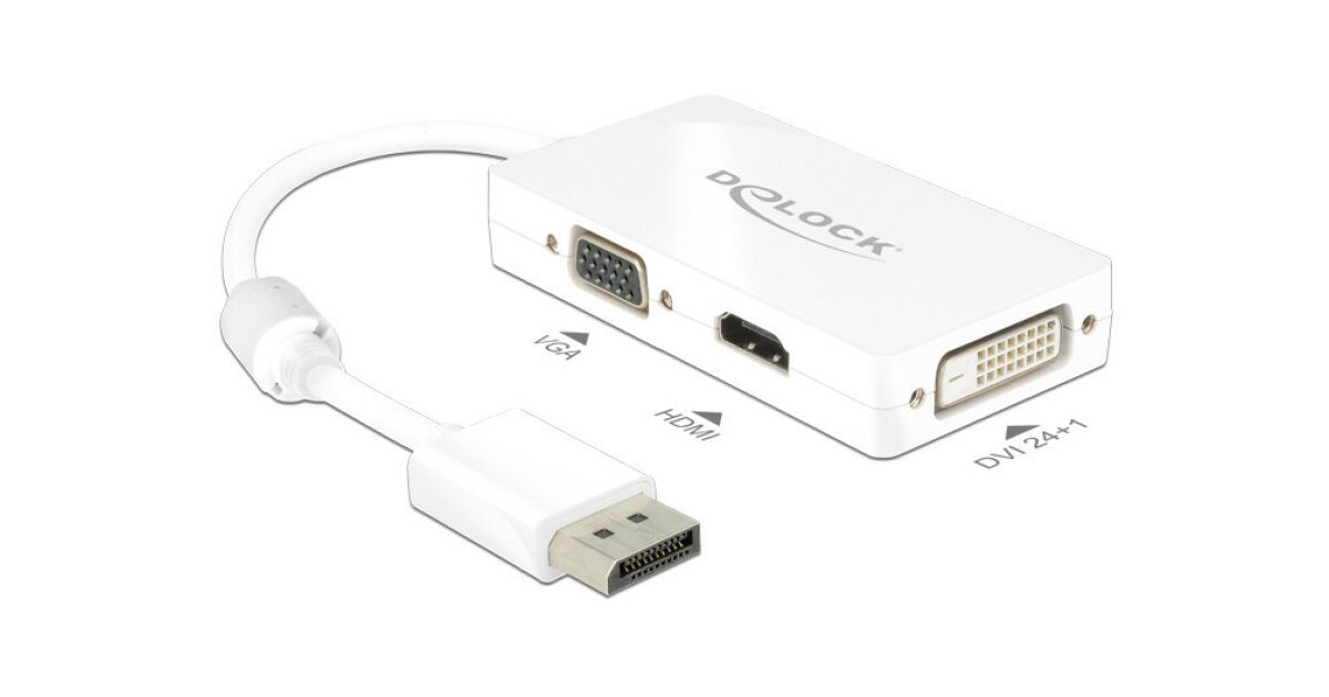Tento Delock DisplayPort adaptér vám umožní rozšíriť váš systém o VGA, HDMI a DVI rozhranie. Jednoducho tak pripojíte rôzne zariadenia, napríklad TV, projektor alebo PC monitor. Dôležité je poznamenať, že pomocou adaptéra môžete naraz používať len jeden monitor.