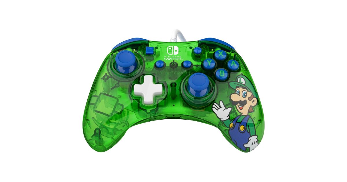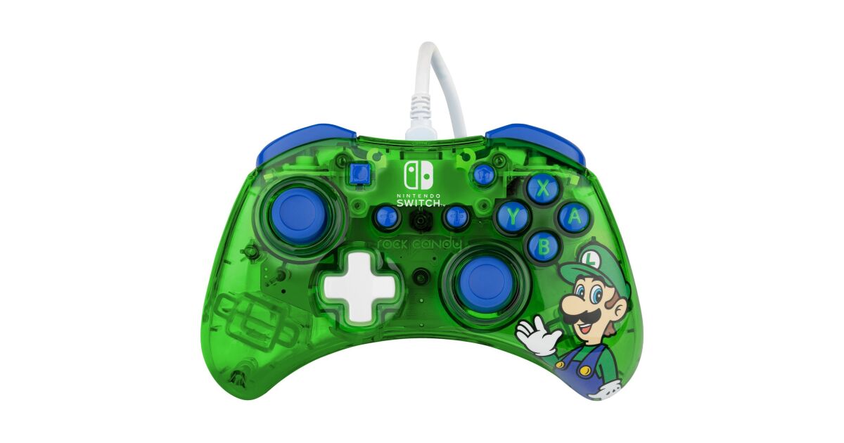 PDP Rock Candy: Luigi Lime. Typ zariadenia: Gamepad, Podporované herné platformy: Nintendo Switch, Nintendo Switch Lite, Nintendo Switch OLED, Herné klávesy: D-pad, Tlačidlo ponuky. Technológia prepojenia: Kábel, Rozhranie zariadenia: USB, Konektor USB: Micro-USB. Farba: Modrá, Zelená, Priesvitné, Základný materiál: Polykarbonát, Dĺžka kábla: 2,5 m. Napájací zdroj: Kábel. Typ balenia: Okenný kvetináč