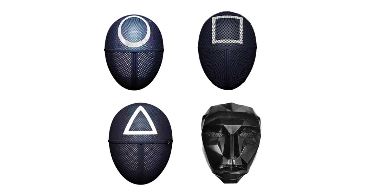 Sada štyroch karnevalových masiek, Squid Game, Triangle, Square, Circle, Black, Leader popis