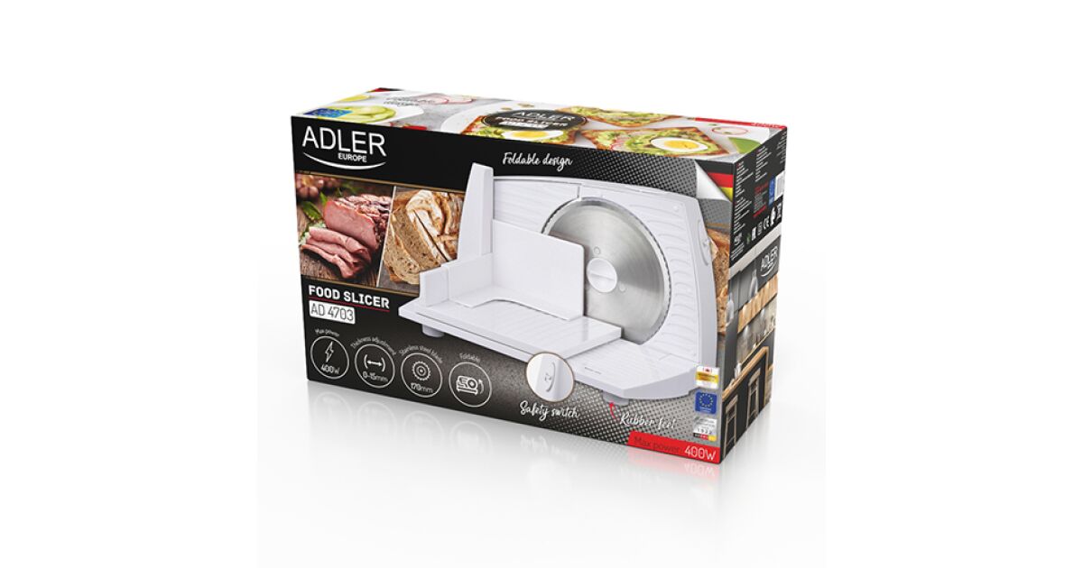 Tento kompaktný a bezpečný elektrický krájač Adler AD 4703 je ideálnou voľbou pre každodenné použitie. S motorom s výkonom 400 W ľahko nakrájate mäso, syr, chlieb a iné potraviny. Čepeľ z nehrdzavejúcej ocele je ostrá a odolná, čím zaisťuje dokonalé plátky.