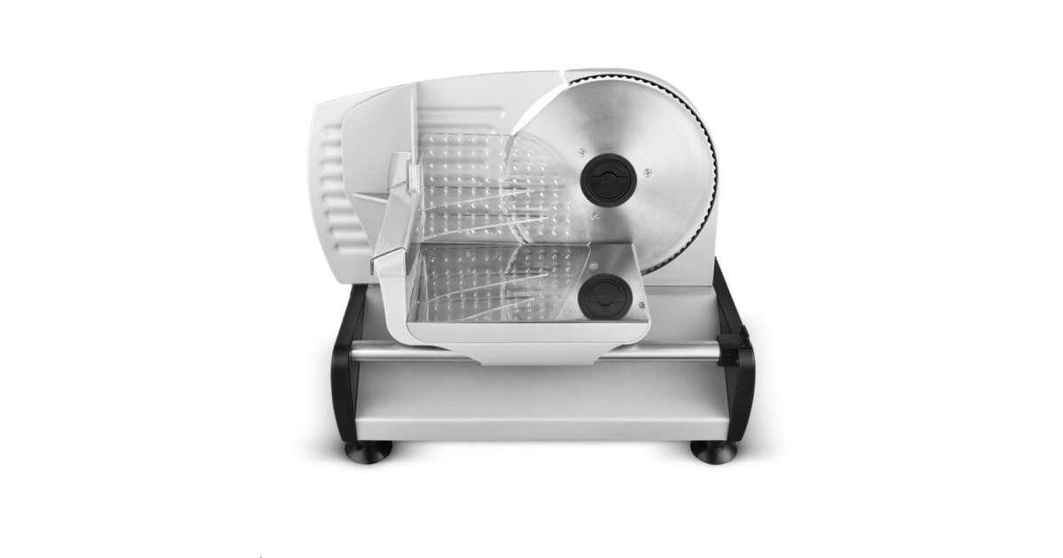 Ideálny na krájanie chleba, mäsa, syra, salámy, klobásy a ďalších výrobkov Protišmykové nožičky pre stabilitu Podporný stôl, chránič rúk a bezpečnostný spínač pre bezpečné používanie Bezpečnostný zámok pre výmenu noža alebo čistenie Odnímateľný rezný kotúč, nerezová oceľ Podávacia doska z nerezovej ocele Hliníkový kryt Priemer čepele: 19 cm Nastaviteľná hrúbka rezu: 0-15 mm Priehľadný držiak potravín poskytuje ochranu pri krájaní 1 prídavný nôž na jemné krájanie Príkon: 150 W Hlučnosť: < 76 dB
