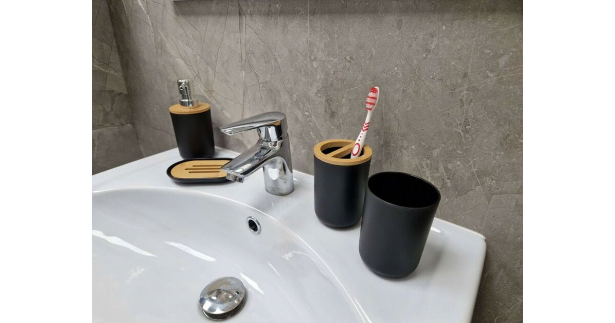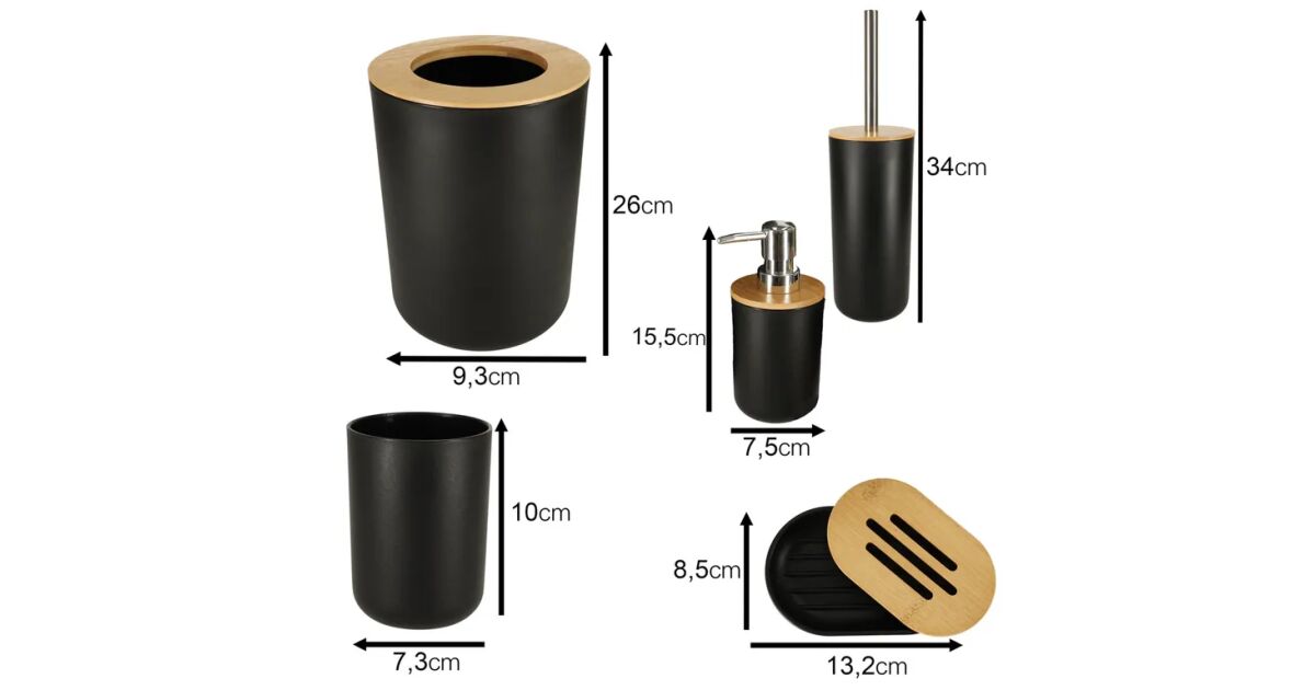 Elegantná kúpeľňová súprava (6-dielna) - ABS + drevo, čierna/hnedá farba 🖤