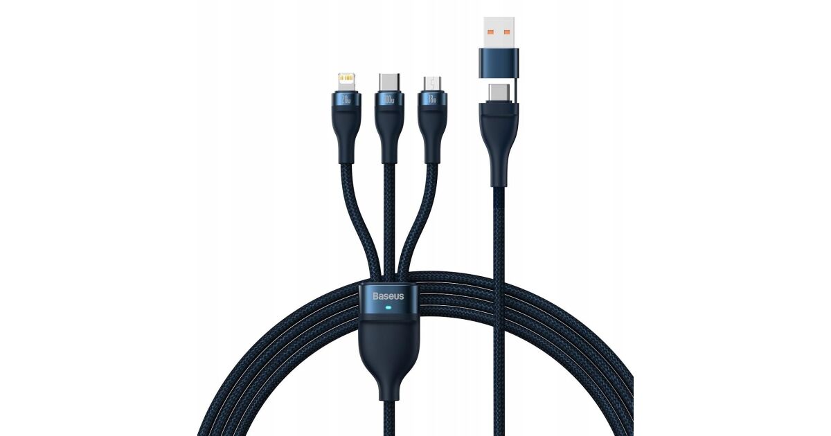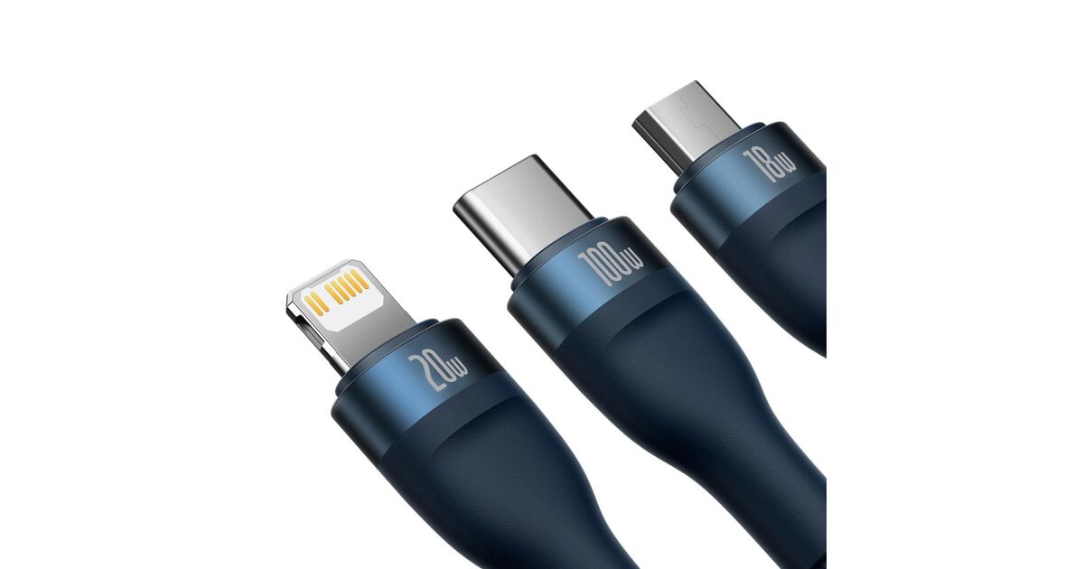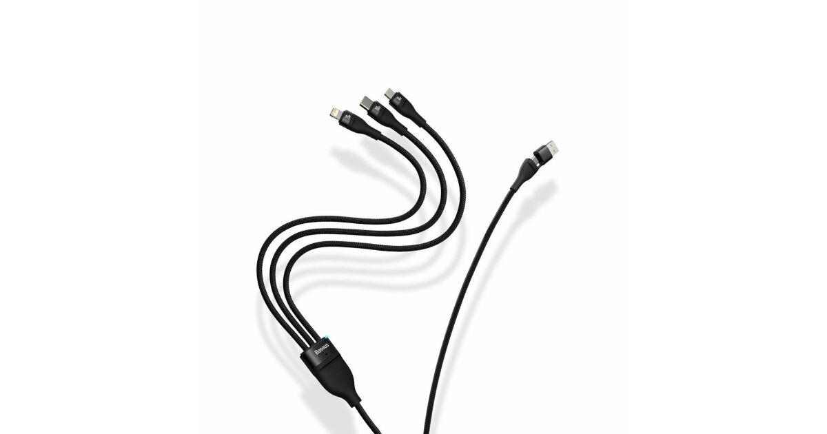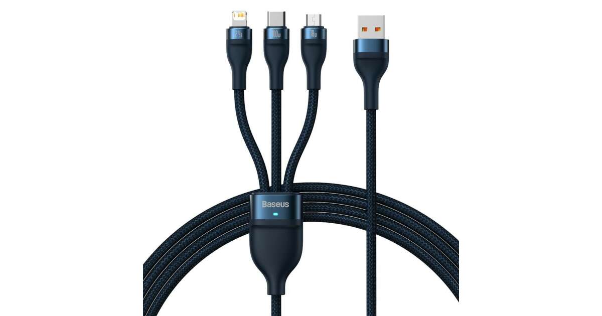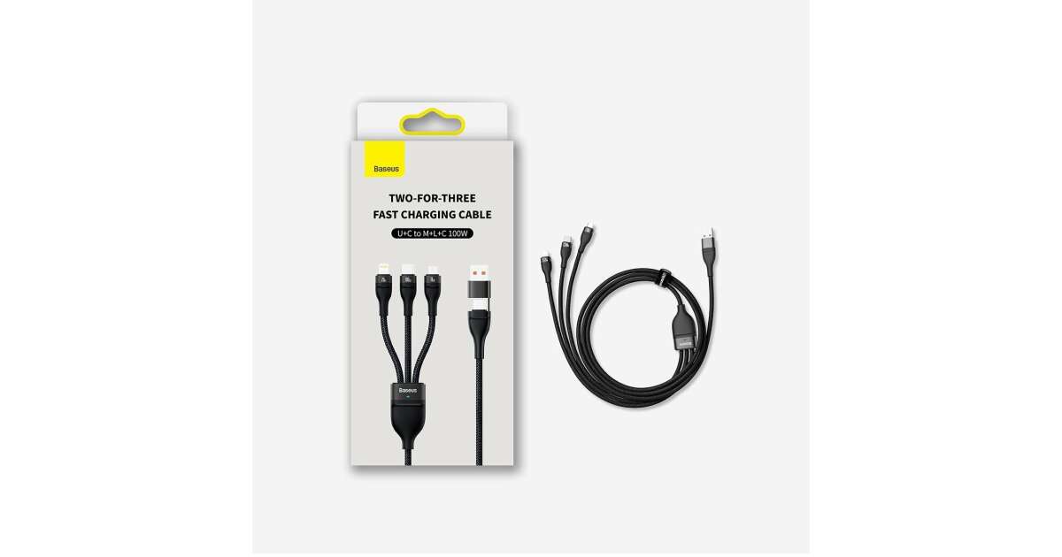 Tento kábel Baseus Flash Series 2 je praktické 3 v 1 riešenie s konektormi USB-C, Micro USB a Lightning, takže jedným káblom nabiješ všetky svoje kompatibilné zariadenia. Vďaka maximálnemu výkonu 100 W nabiješ svoj telefón, tablet alebo notebook neuveriteľne rýchlo. ⚡️