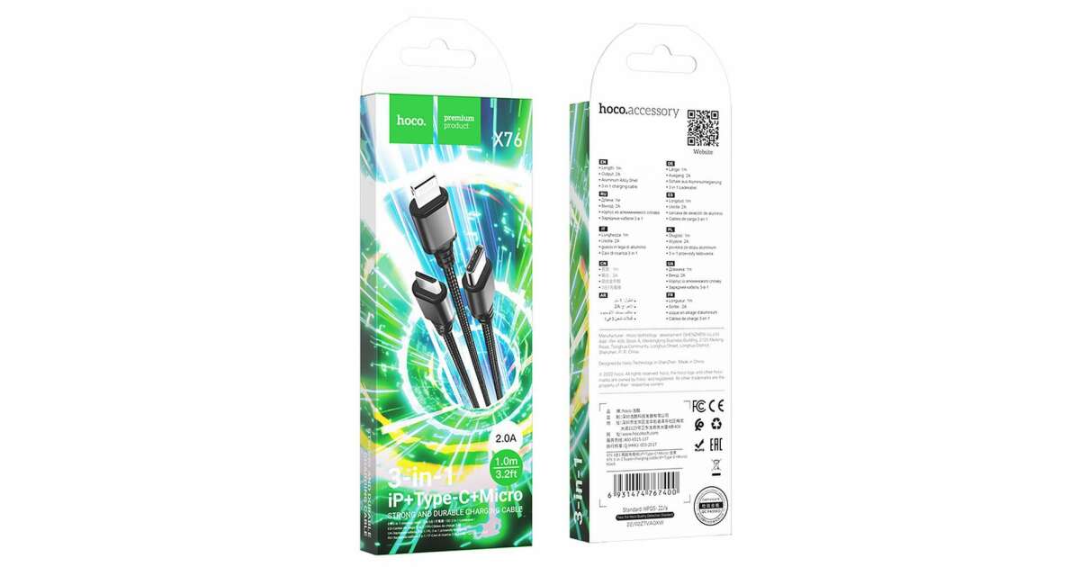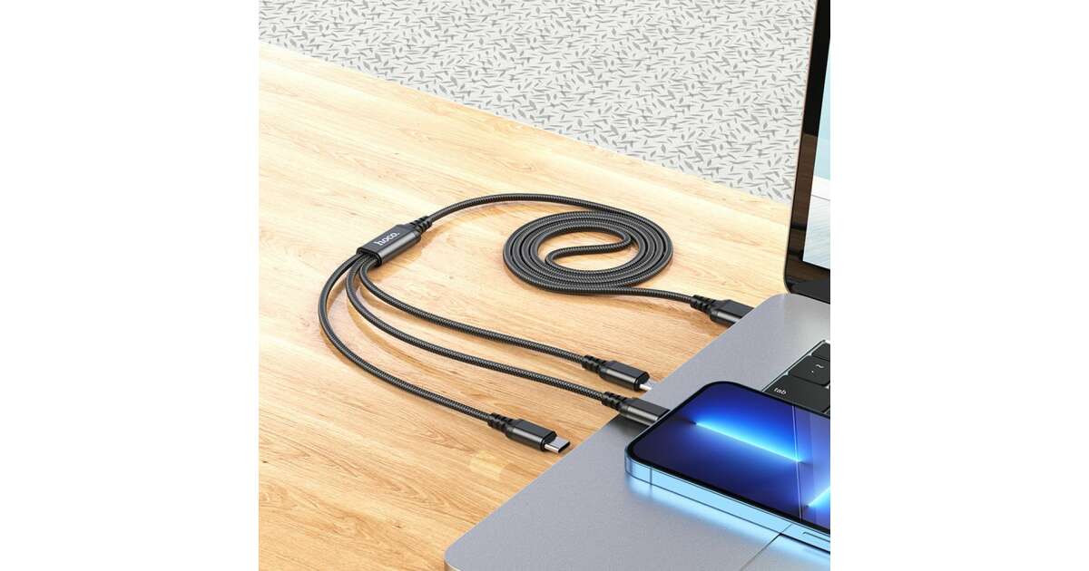 HOCO X76 je univerzálny nabíjací kábel, ktorý má tri rôzne konektory: Lightning, Micro USB a USB-C. S týmto káblom môžete nabíjať viac zariadení naraz, či už ide o iPhone, telefón s Androidom alebo iné zariadenie používajúce USB-C.
