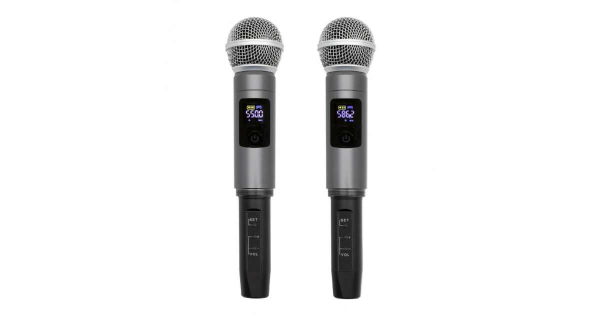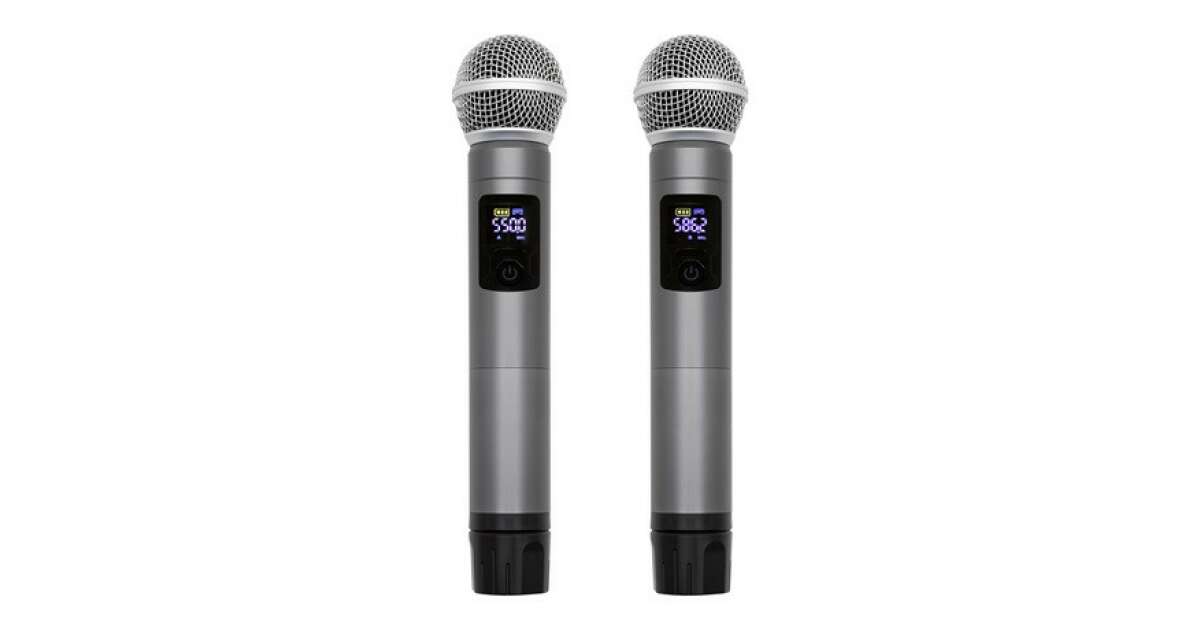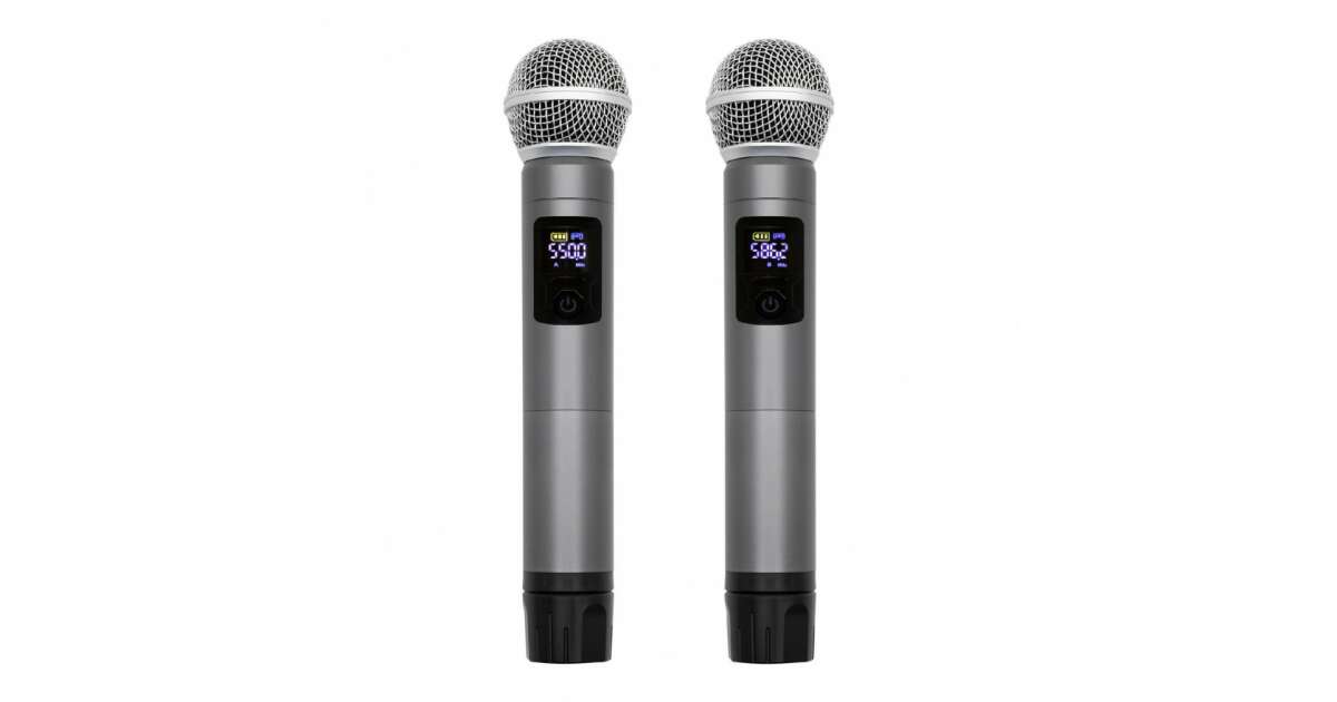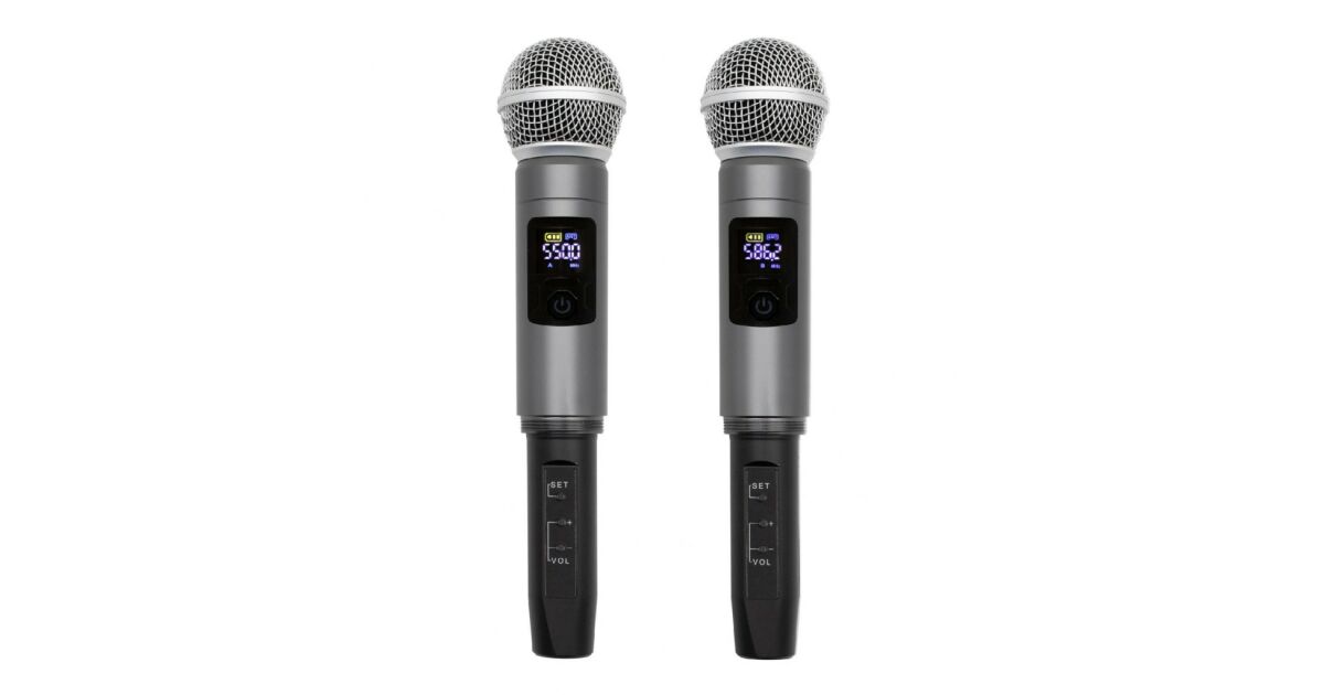 - Dva robustné, kovové ručné mikrofóny: Odolné a elegantné prevedenie.