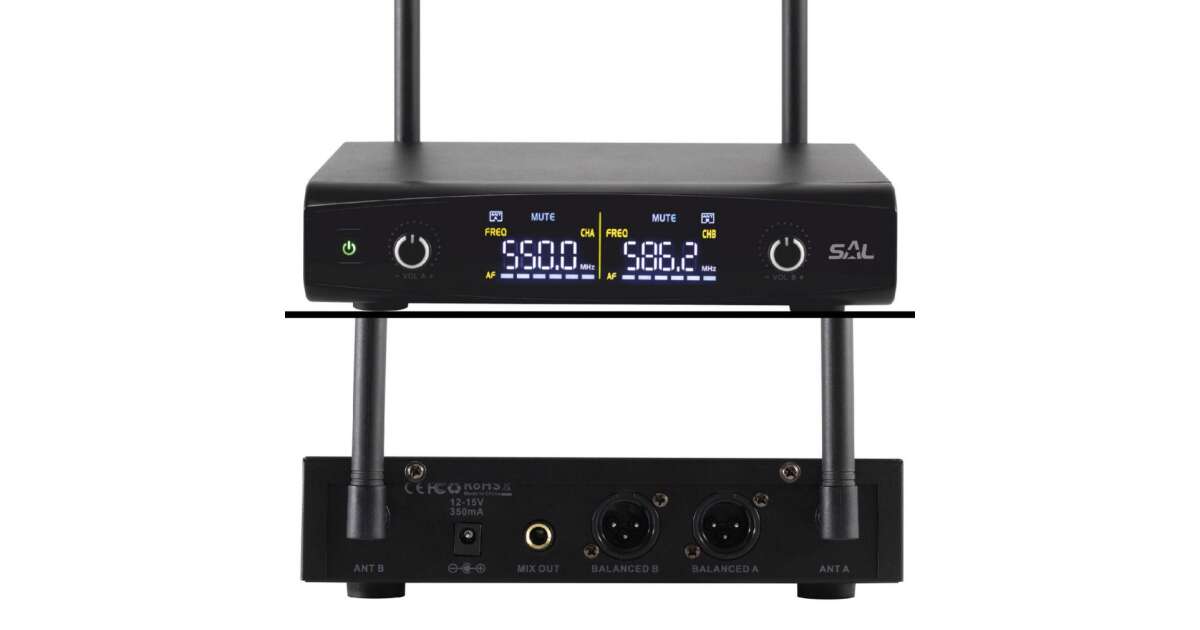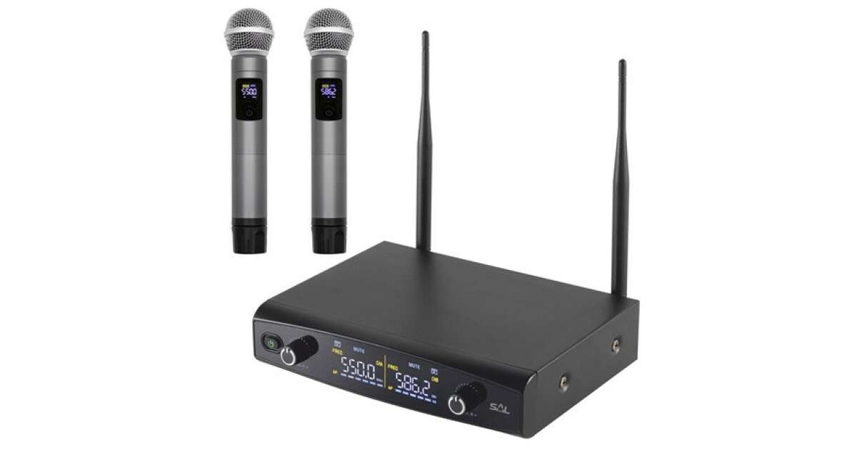 Bezdrôtový mikrofónový set SAL MVN 600, digitálne filtrovanie šumu, 2x30 kanálov, dosah ~80 m, frekvenčné pásmo UHF