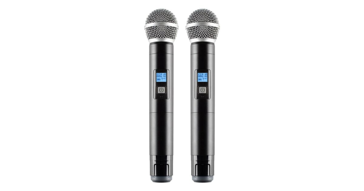 Profesionálna bezdrôtová mikrofónna súprava SAL MVN610, dosah cca 50 m, kovové ručné mikrofóny, stolný profesionálny prijímač, automatické párovanie, 2x100 kanálov UHF pre príjem bez rušenia