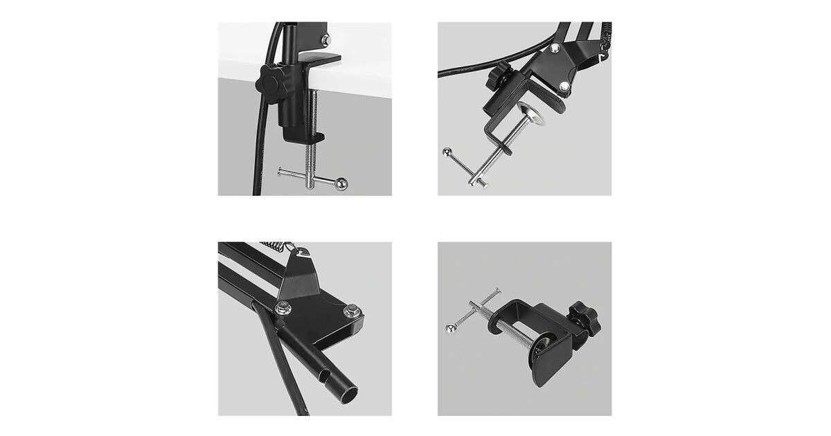 - Nastaviteľný stolný mikrofónový stojan s dvojitým ramenom pre flexibilné umiestnenie.