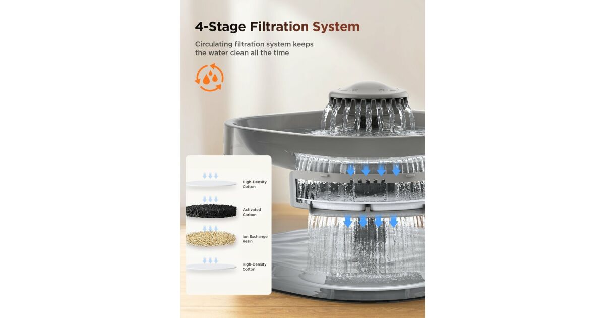 Prilákajte domáce zvieratá na pitie! Z 9-prúdovej fontány nepretržite vyteká čerstvá, filtrovaná voda, ktorá priťahuje pozornosť domácich miláčikov a podnecuje ich záujem. Veľká kapacita: objem 7 l robí túto fontánu ideálnou na zásobovanie domácich miláčikov vodou na niekoľko dní. Priestranný priestor na pitie je vhodný pre psov a mačky všetkých vekových kategórií a obzvlášť skvelý pre viacero domácich zvierat, čím sa minimalizuje striekanie a rozlievanie vody. Bezpečný zámok. Špeciálne upevňovacie prvky na oboch stranách bezpečne spájajú zásobník na vodu a základňu, čím zabraňujú náhodnému rozliatiu vody počas hry. Ultra tichá odolná pumpa. Automatická fontána je vybavená ultra tichým čerpadlom, ktoré zaisťuje tichý chod.