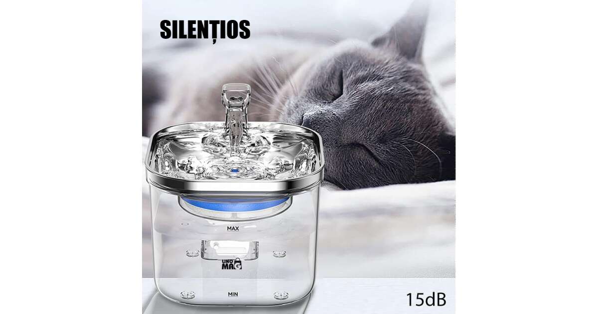 Automatický dávkovač vody, typ fontány pre mačky a psy, Linomag®, Čistenie a filtrácia vody, Nerez, Regulácia prietoku, 2L, Transparent