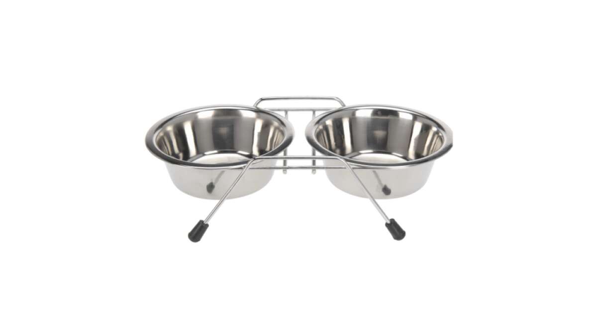 Sada 2 misiek, pre psy a mačky, so stojanom, vyrobené z nehrdzavejúcej ocele, 34,5x16,5x8 cm, 0,8 l
