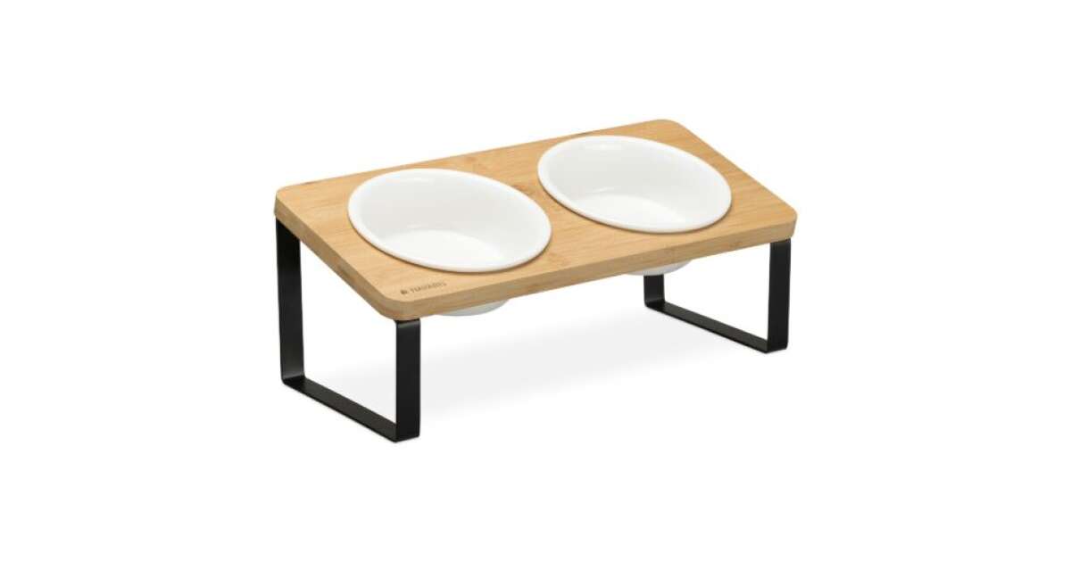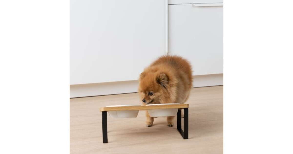 Pozdvihnite stolovanie svojho miláčika s týmto štýlovým a praktickým stojanom na kŕmenie! Skladá sa z dvoch keramických misiek a pevnej konštrukcie z bambusu a železa, ktorá zaisťuje stabilitu a pohodlie.