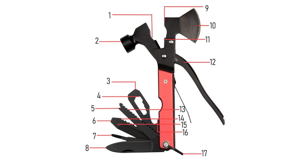 - 🧰 16 rôznych funkcií: kliešte, kladivo, sekera, dvojitá píla, pílka na drevo, hviezdicové kľúče, otvárač na fľaše, krížový skrutkovač, 2 ploché skrutkovače, nôž, čepeľ na odstraňovanie háčikov, 2 zveráky, držiak klieští