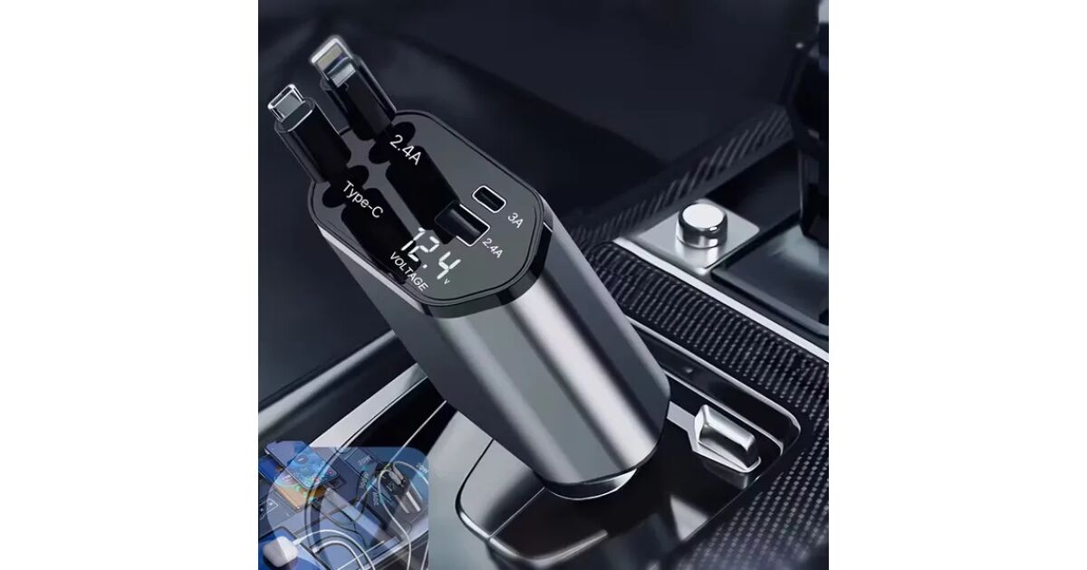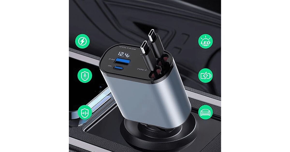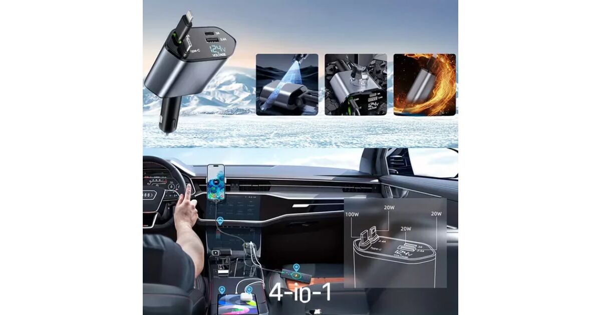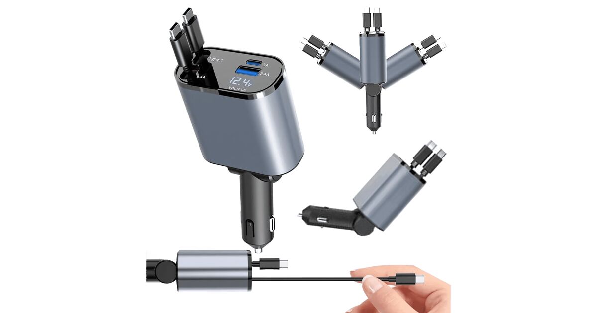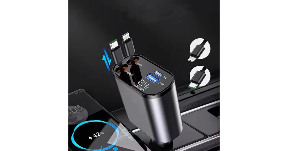 Táto multifunkčná nabíjačka do auta vám umožní nabíjať až štyri zariadenia naraz na cestách. A vďaka zaťahovaciemu káblu je neporiadok minulosťou!