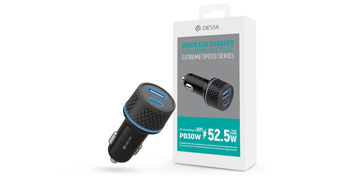 Devia szivargyújtós töltő adapter USB + Type-C bemenettel - 52,5W - Devia Extreme Speed Series Quick Car Charger PD 30W + QC 3.0 - black popis