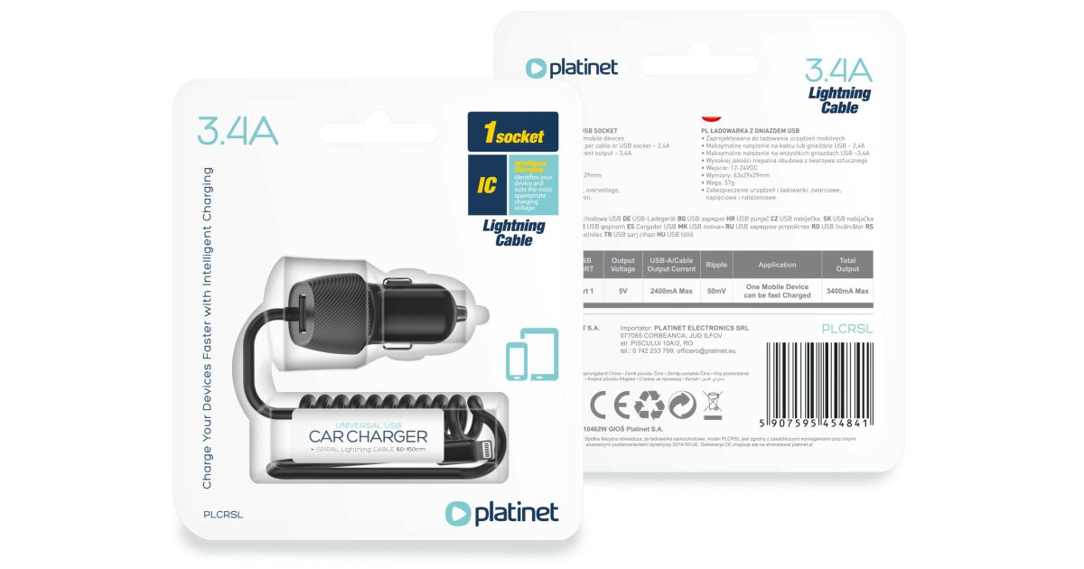 S 17 W nabíjačkou do auta Platinet sa už nikdy nemusíte obávať vybitého telefónu! Táto praktická nabíjačka má port USB-A a špirálový kábel Lightning, takže môžete nabíjať až dve zariadenia súčasne. Je ideálna na každodenné použitie aj na dlhšie cesty.