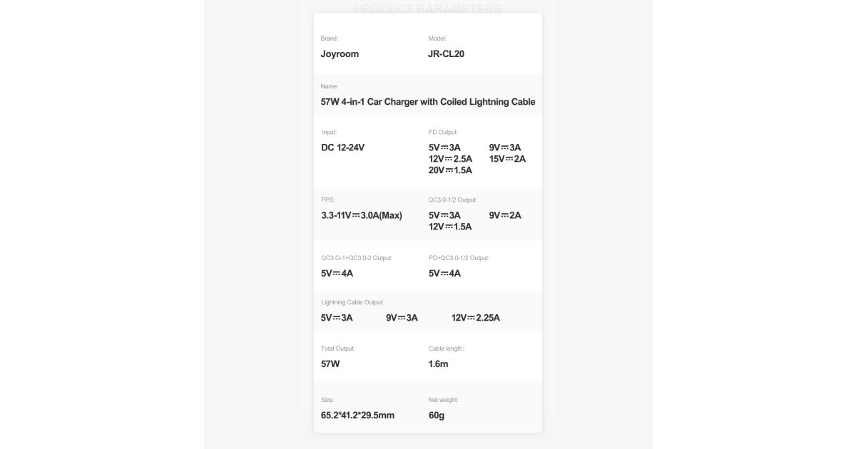 Rýchla autonabíjačka Joyroom 4 v 1 PD QC3.0 AFC FCP s 1,6 m 57 W Lightning káblom, čierny popis
