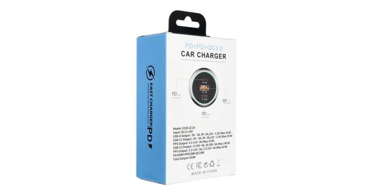 Samochodová USB QC 3.0 + 2x typ C PD CC69-2C1A (celkom 191 W)