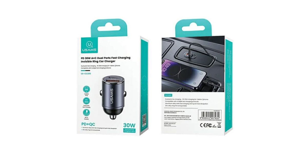 Táto kompaktná nabíjačka do auta USAMS má dva porty: USB-A a USB-C, ktoré poskytujú výkon 30 W pre rýchle a efektívne nabíjanie. Vďaka integrovanému oceľovému krúžku sa dá ľahko pripevniť a prenášať.