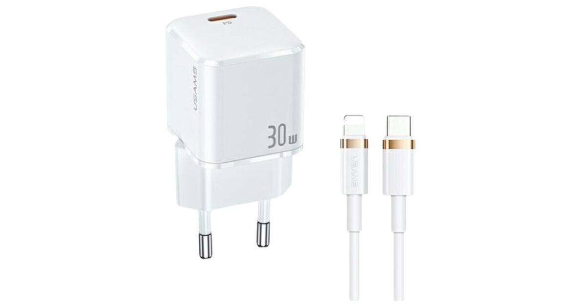 USAMS nástenná nabíjačka 1xUSB-C T45 30W PD3.0 +QC3.0 rýchle nabíjanie + kábel U63 USB-C/Lightning biely UXTZH02 (USAMS-UX)