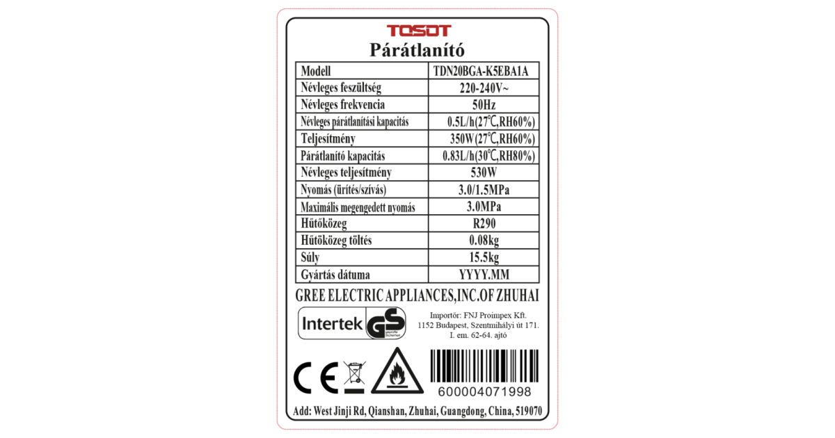 Odvlhčovač vzduchu Tosot TDN20BGB-K5EBA1A, 530W, 20L/24h, 1,8L, biely popis