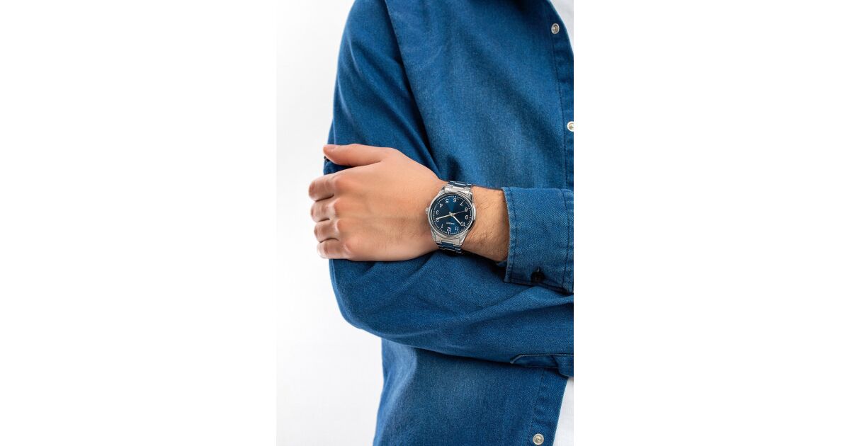 - 🎨 Farba: Tmavomodrý ciferník, strieborné puzdro a remienok
