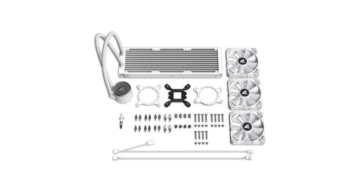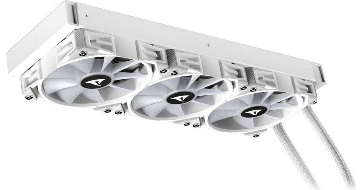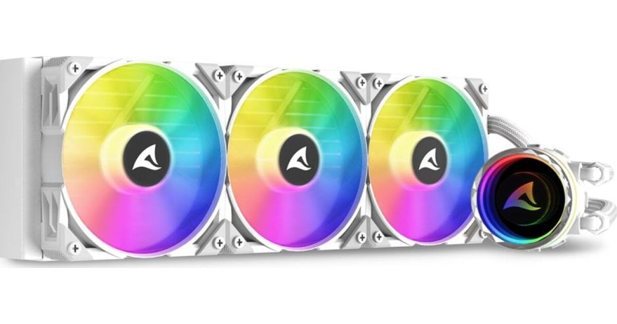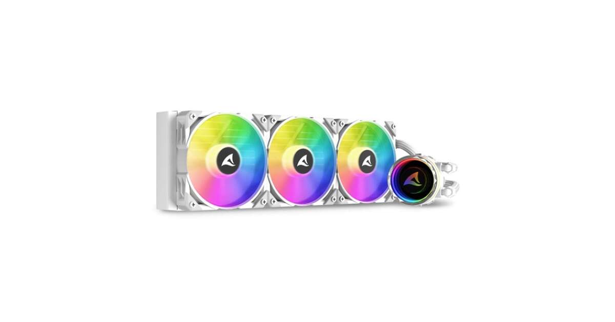Vodný chladič CPU Sharkoon - S90 RGB White AIO 360 mm (max. 35 dB (A); max. 131,93 m3/h; 3x12cm, A-RGB LED, biely) popis