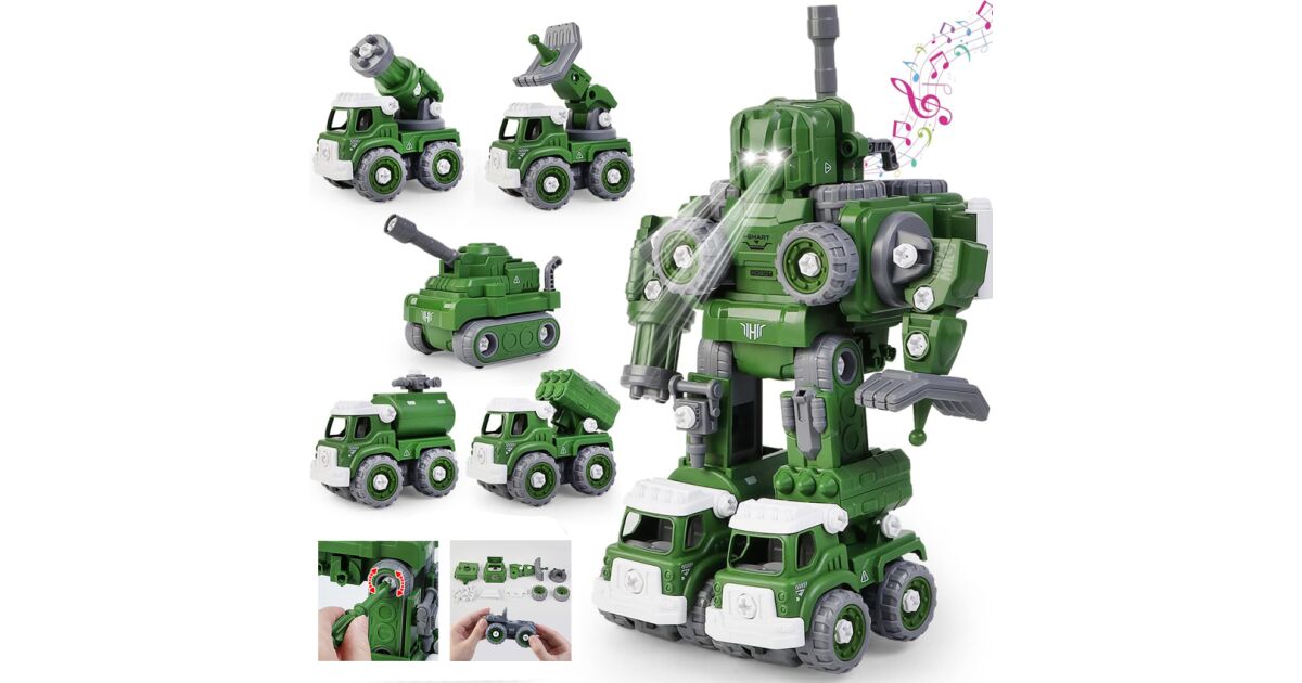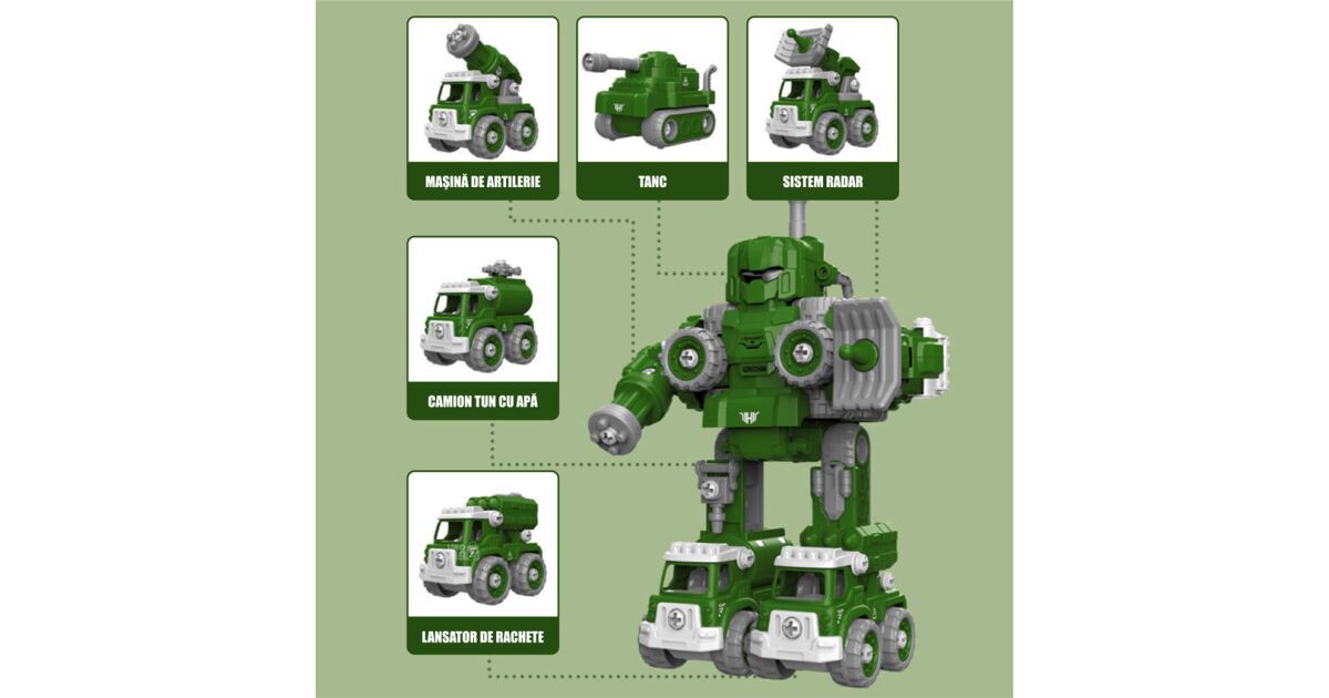 - Zábavná hračka: Dva spôsoby montáže: 5 samostatných vozidiel alebo jeden veľký robot.