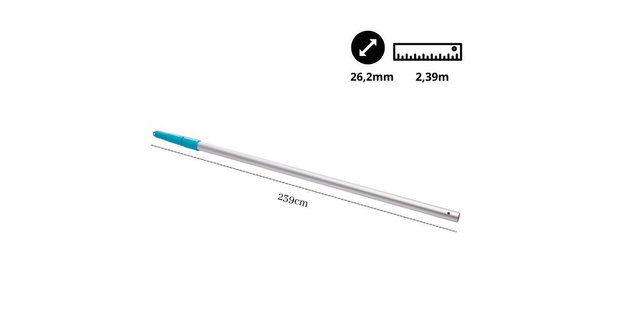 Ľahká, odolná hliníková teleskopická tyč, ideálna na čistenie bazénov. S dĺžkou 2,39 metra ľahko dosiahnete na všetky miesta bazéna a pohodlne a efektívne vykonáte čistenie.