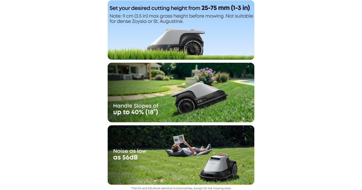 Robotická kosačka eufy E15, výška kosenia 2,5 – 7,6 cm, viaczónové riadenie, automatické mapovanie, inteligentná navigácia, vyhýbanie sa prekážkam popis
