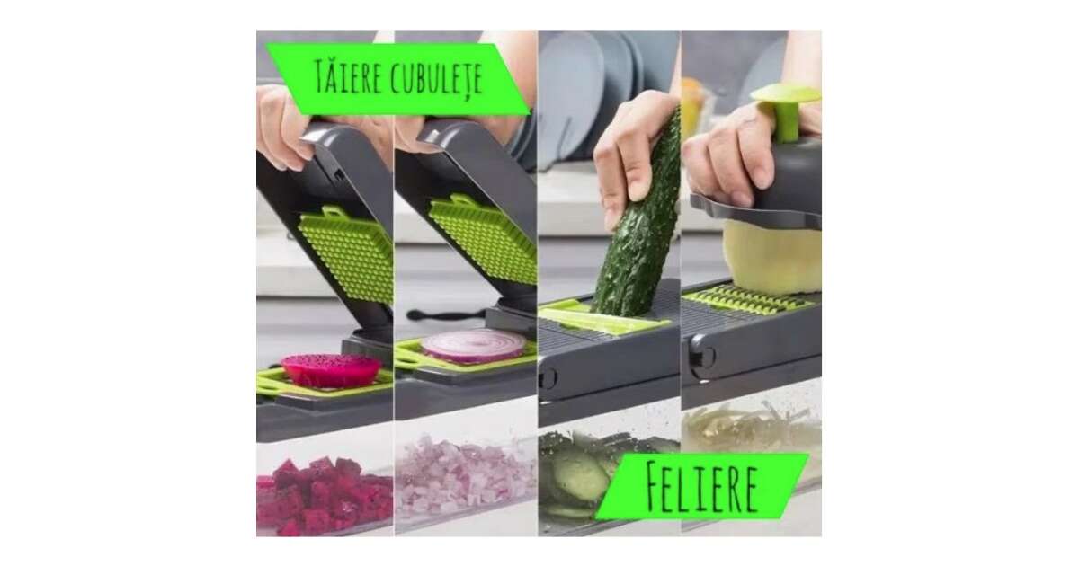 Multifunkčný krájač, flippy, strúhadlá, 8 v 1, na ovocie a zeleninu, 10 kusov, čepele z nehrdzavejúcej ocele, zásobník, oddeľovač vajec, ochrana rúk, ABS, 32,2 x 11,3 cm, zelená/sivá popis