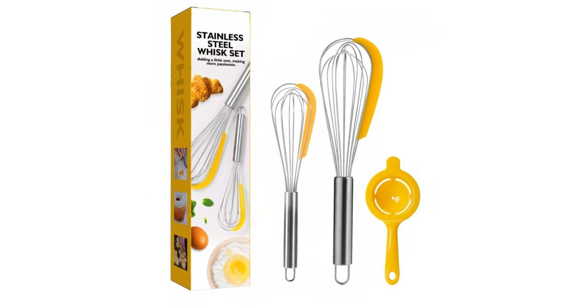 Táto súprava 3 kuchynských pomôcok je nevyhnutná pre všetky tvoje pekárske dobrodružstvá! Obsahuje dve šľahacie metly rôznych veľkostí a praktický oddeľovač vajec, aby bol proces pečenia hladký. Šľahacie metly sú vyrobené z nehrdzavejúcej ocele a oddeľovač vajec zo žltého silikónu, takže sa ľahko čistia a sú odolné.