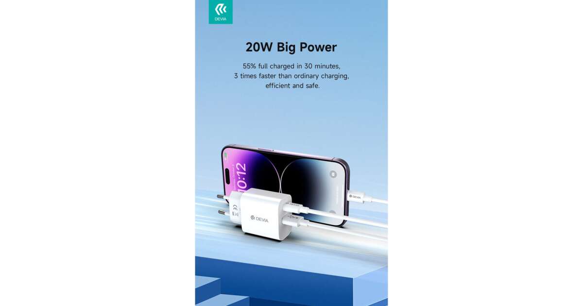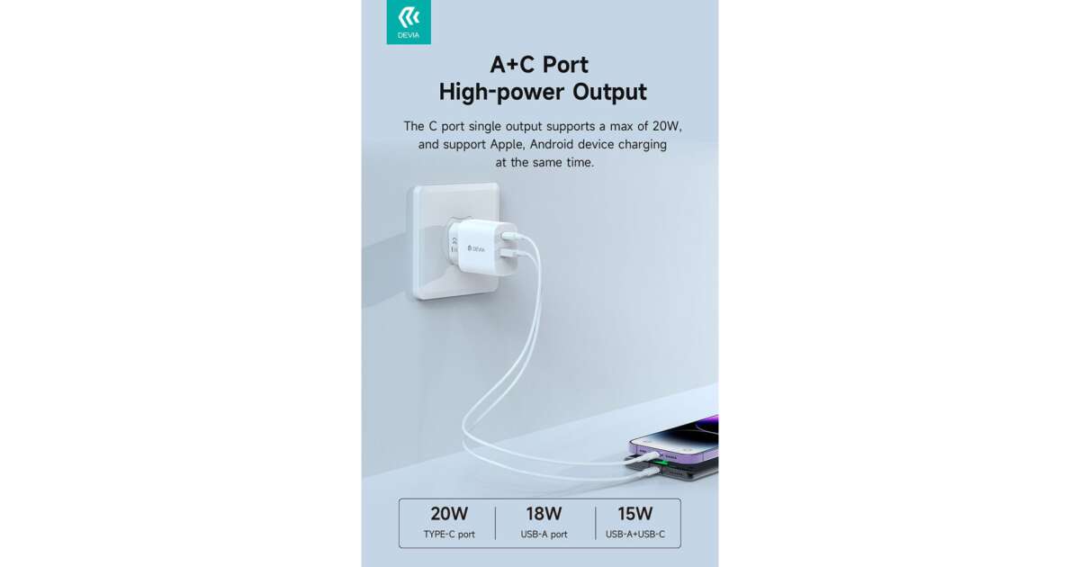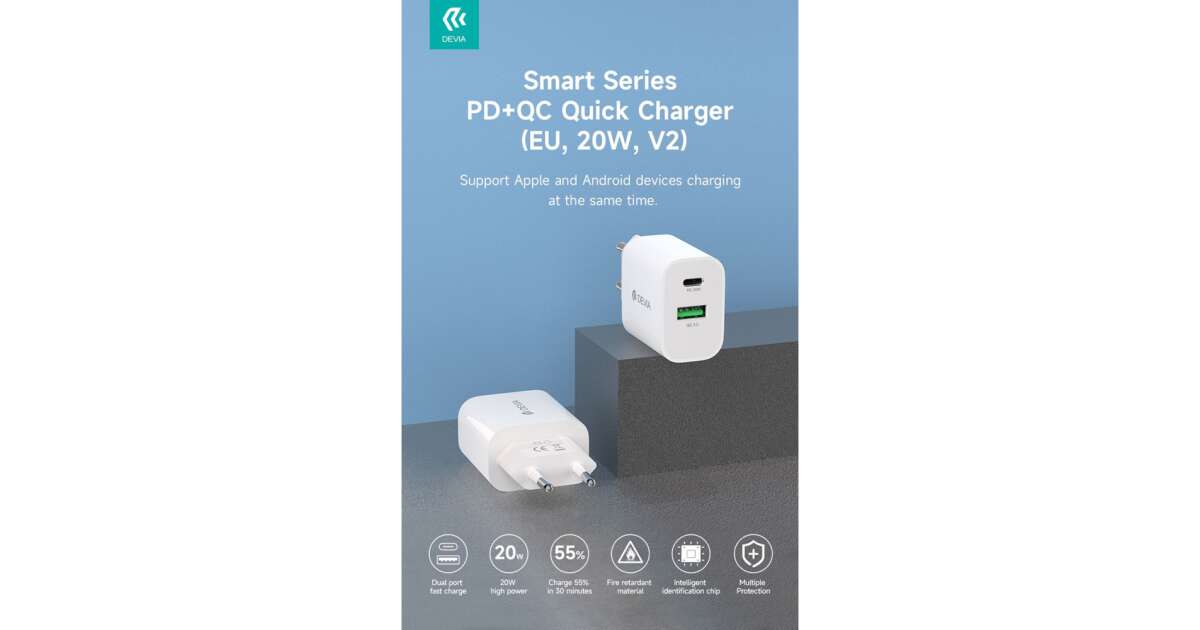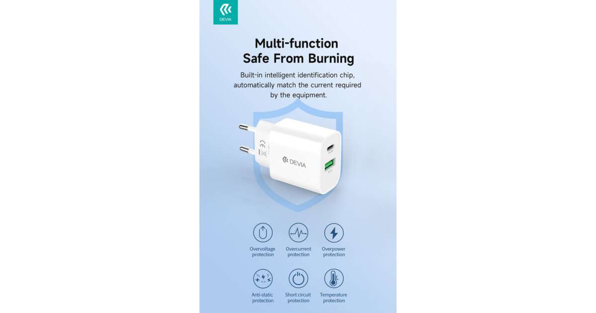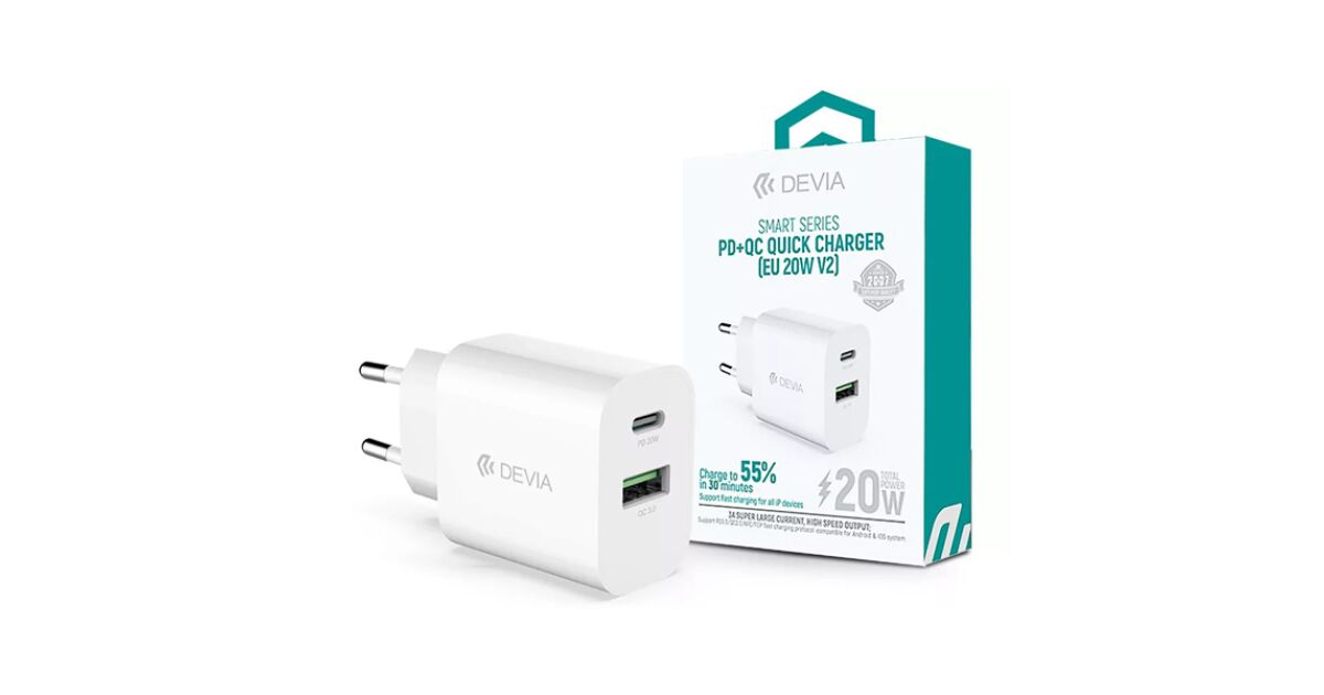 Vyber si sieťovú nabíjačku Devia 20W USB-C/USB-A a užívaj si rýchle, bezpečné a pohodlné nabíjanie!