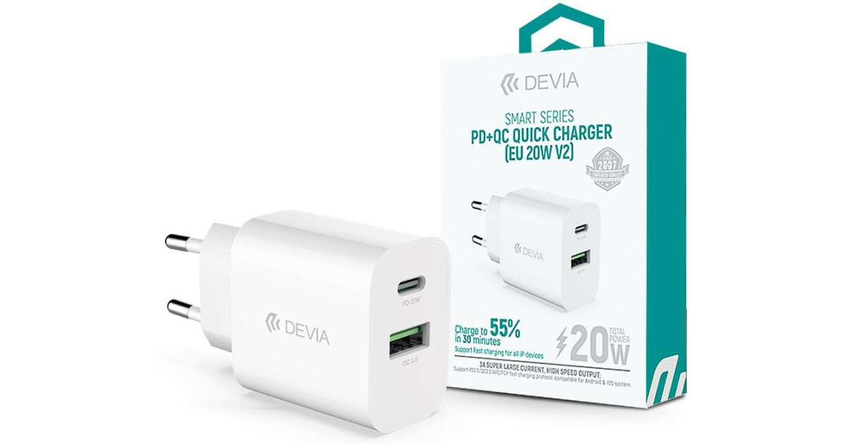 Devia sieťový nabíjací adaptér s Type-C + USB vstupom - 20W - Devia Smart Series PD3.0 + QC3.0 Quick Charger V2 - biely