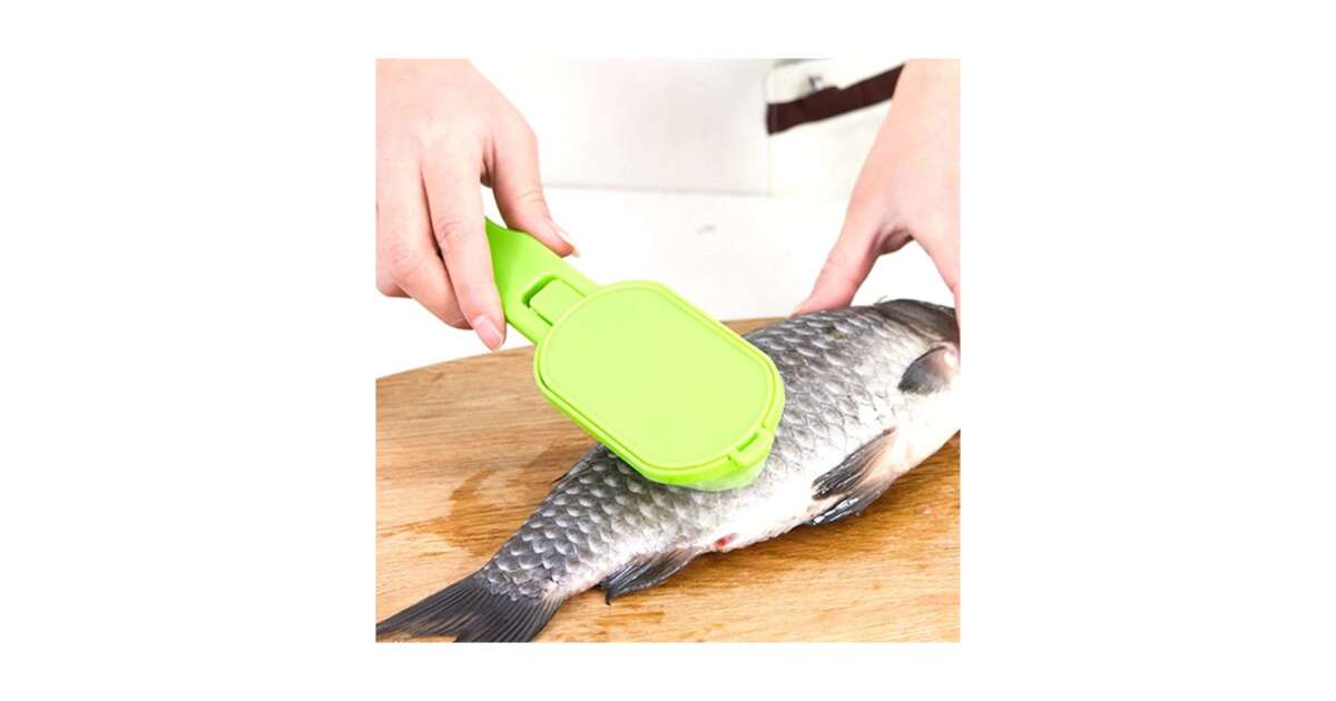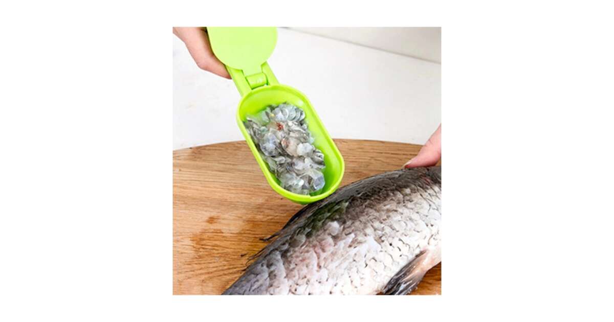 Čistič rýb, MyVit, obsahujúci úložnú vaňu na rybie šupiny a vstavaný mini nôž z nehrdzavejúcej ocele na škrabanie váh, zelený popis