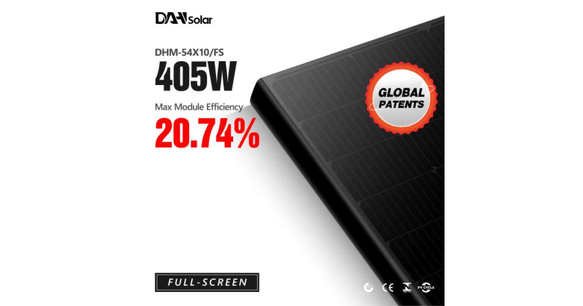 DAH Solar DHM-54X10/FS(BB) 405W Full Screen Full Black with white backsheet Mono 405W solárny panel Počet článkov 108 Typ článku Mono Výrobca DAH SOLAR Účinnosť 20,74 Rozmer 1722 × 1134 × 32 mm Prevádzkový prúd v pracovnom bode Impp 12,85 Prevádzkové napätie v pracovnom bode Vmpp 31,5 Skratový prúd Isc 13,54 Napätie otvoreného obvodu Voc 37