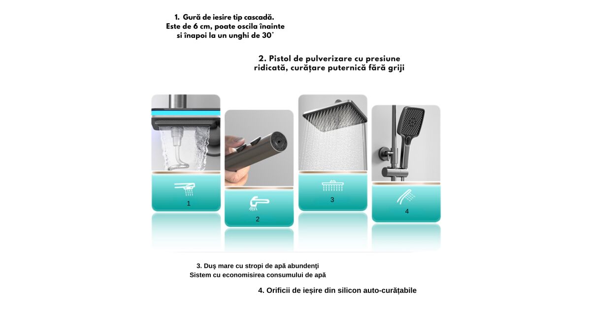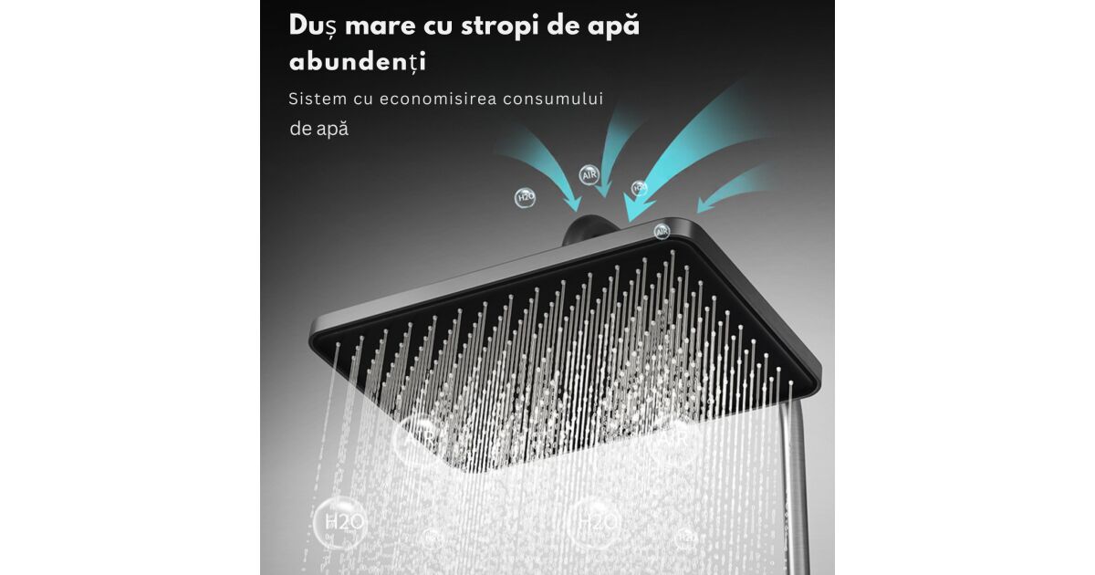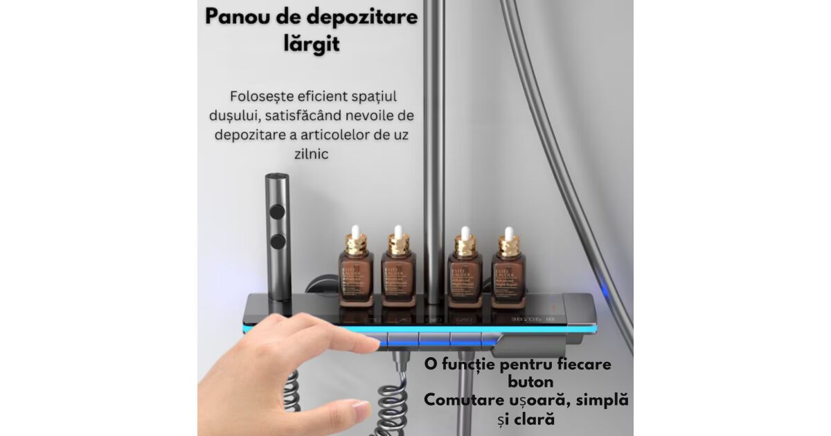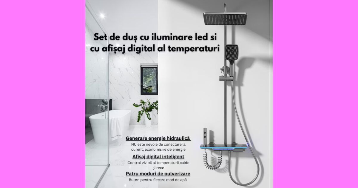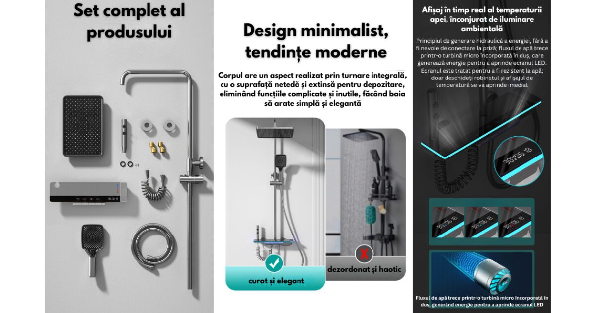 Set de dus cu Iluminare LED si afisaj Digital al Temperaturi, coloana cu termostat si turbina generatoare de curent integrata, 4 functii de curgere a apei, dus reglabil, fix tip ploaie, robin popis