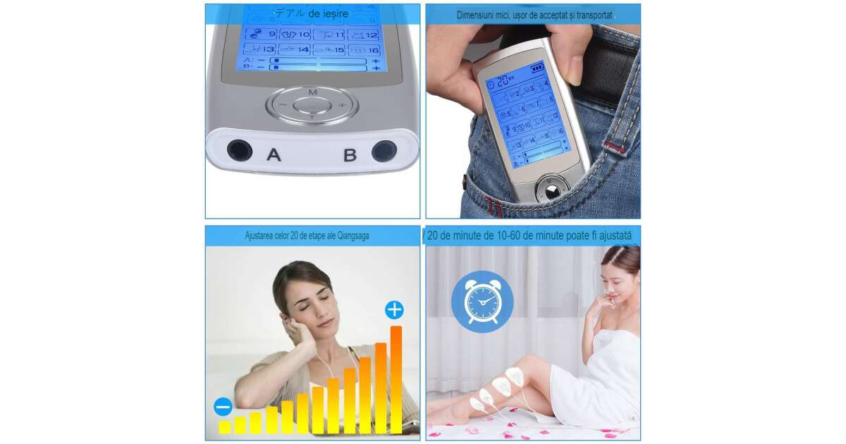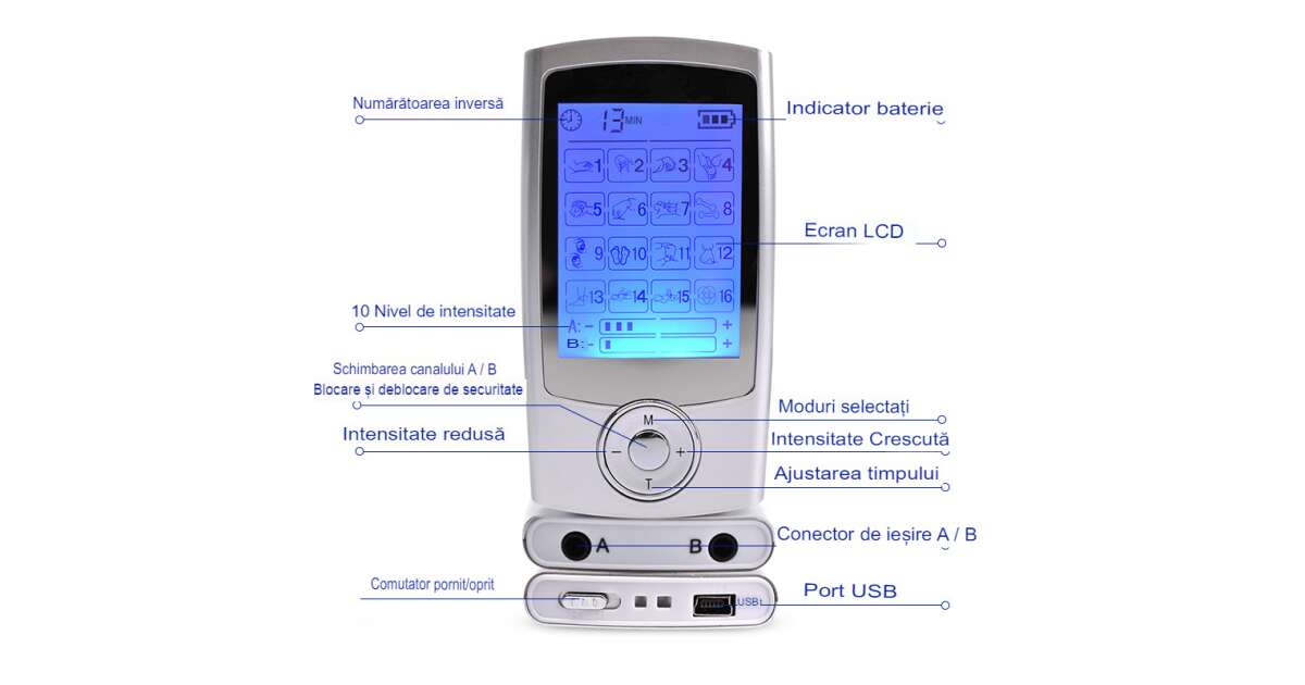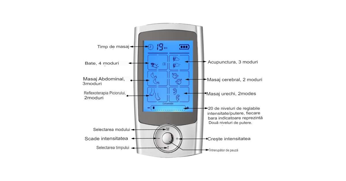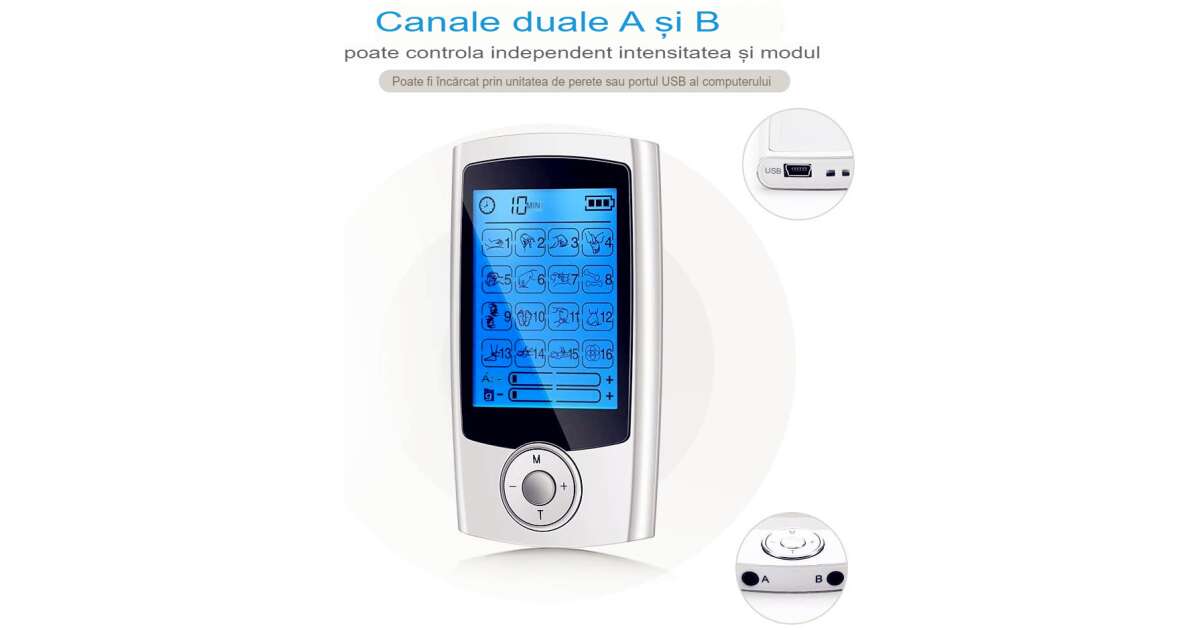 Masážny prístroj s elektrostimuláciou/fyzioterapiou MAYA MY-S044C-A, stimulátor so 16 režimami, dvojkanálový, s 20 úrovňami intenzity, 4 elektródy, dva kanály na použitie, 16 masážnych progra popis